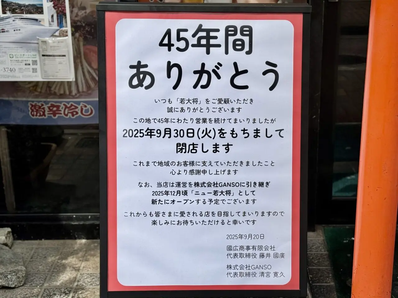 大きく「45年間ありがとう」の文字と、「これまで地域のお客様に支えていただきました」と感謝の言葉が綴られています。さらに、若大将は運営を株式会社GANSOに引き継ぎ2025年12月頃「ニュー若大将」として新たにオープンする予定であることが書かれています。