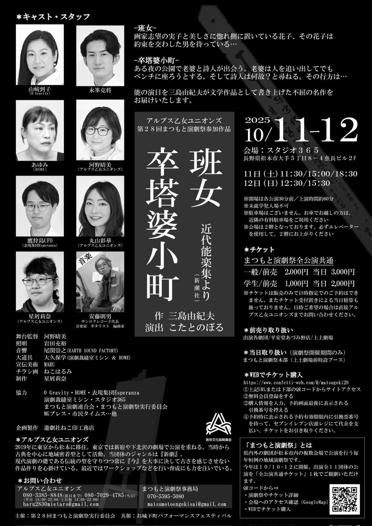 参加団体の一つ、 アルプス乙女ユニオンズはまつもと演劇祭では初めての会場となる「スタジオ365」で「班女・卒塔婆小町」を公演します。