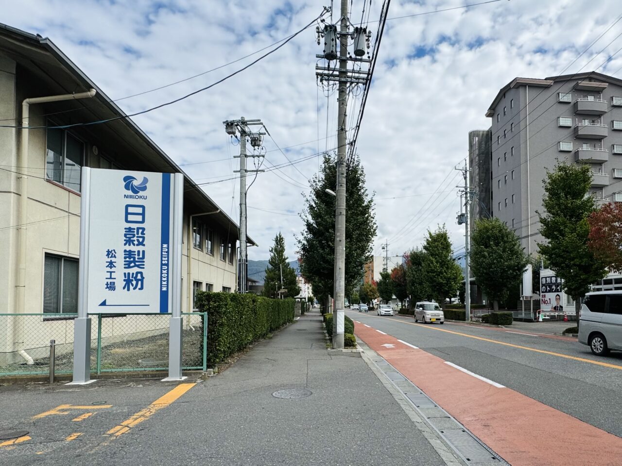 国道19号線、南松本信号を東へ南松本駅方面へ進んでいくと左側に「日穀製粉松本工場」があります。道路を挟んで反対側には中国四川料理の店「四川乃華」がある場所です。