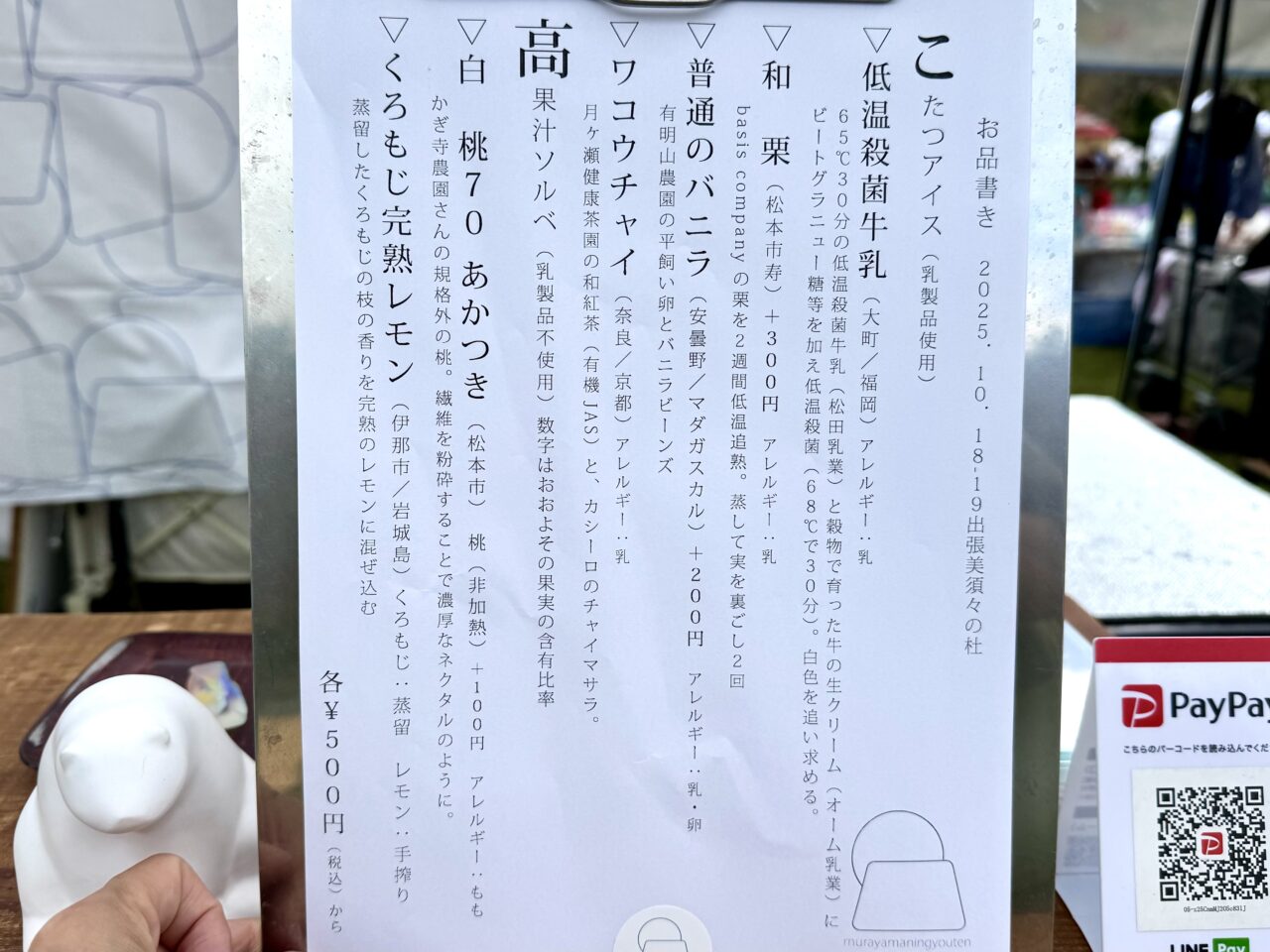 シンプルなお店ながらとても気になったのは「murayamaningyouten ice cream」。松本の 凍らせた果実を滑らかに味わうと書かれた看板を見て通る人が足を止めていました。