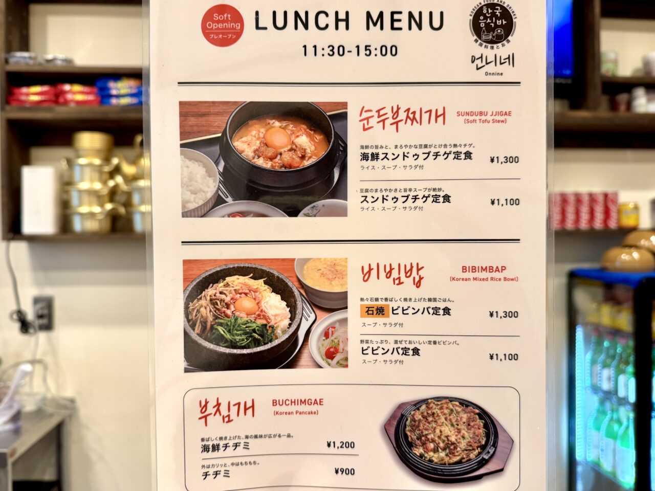 海鮮スンドゥブチゲ定食や石焼ビビンバ定食、海鮮チヂミなど韓国料理のメニューが並んでいます。