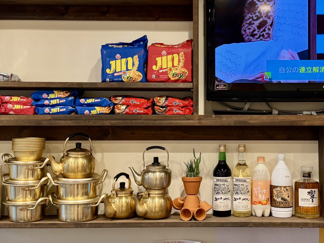店内は韓国の雰囲気、棚にはやかんがありました。これでマッコリを飲んだら美味しそうですね。