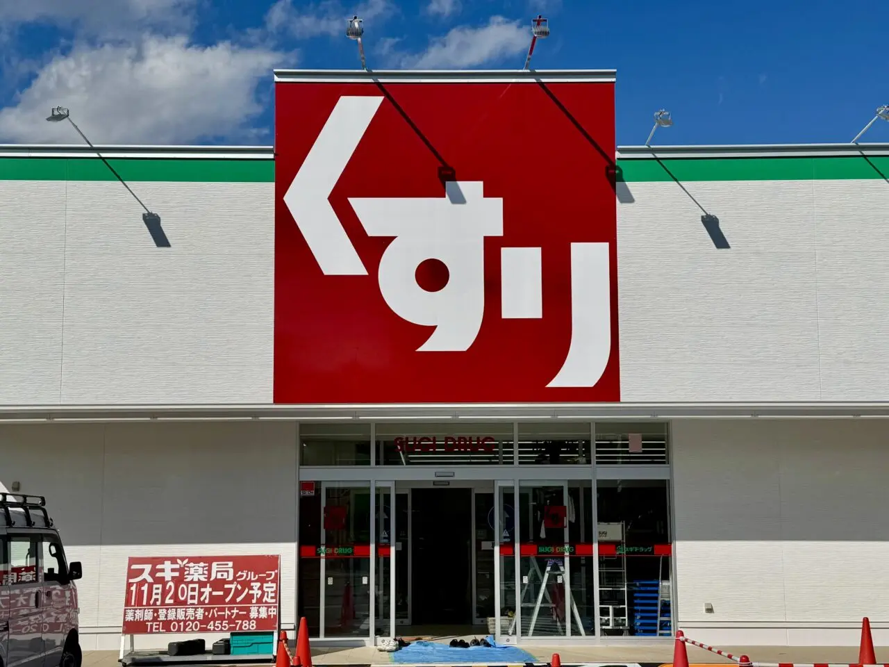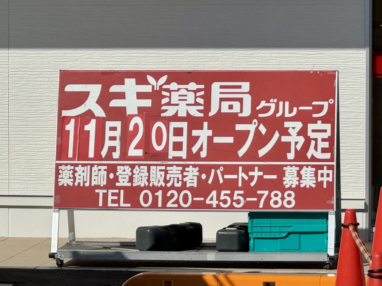 【松本市】井川城で工事中の「スギ薬局」は外観が出来上がってきました。入り口付近にはオープン予定日も!