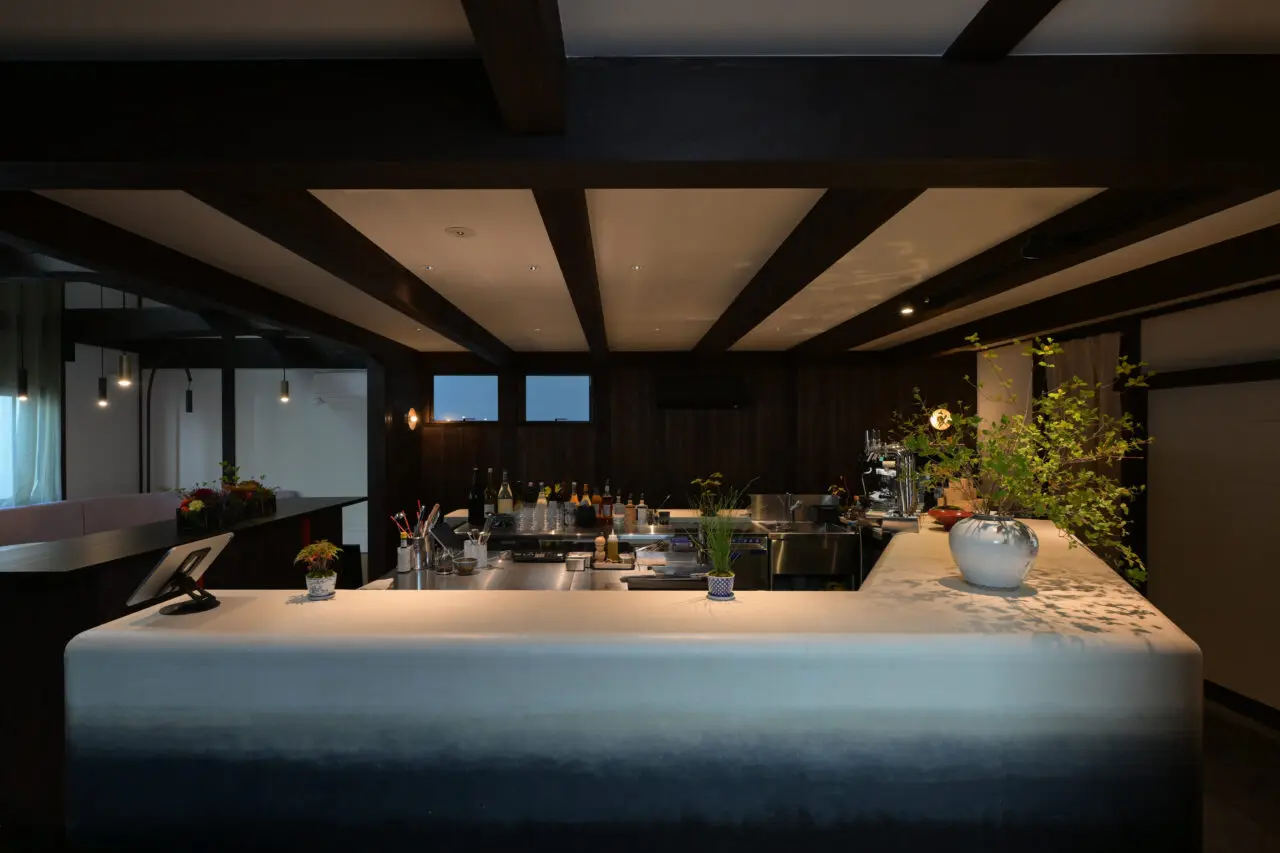 伝統技巧と現代的な設備を融合し、居心地の良さと美しさを両立。カウンターは松本城をモチーフに黒漆塗り、和紙を重ねて作られているそうです!グラデーションが美しいですね。