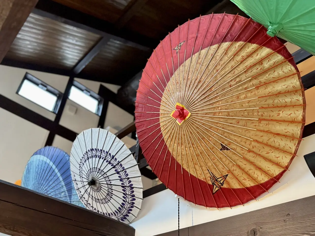 天井の方を見上げてみると、立派な梁と色鮮やかな傘がたくさんあり目を楽しませてくれます。