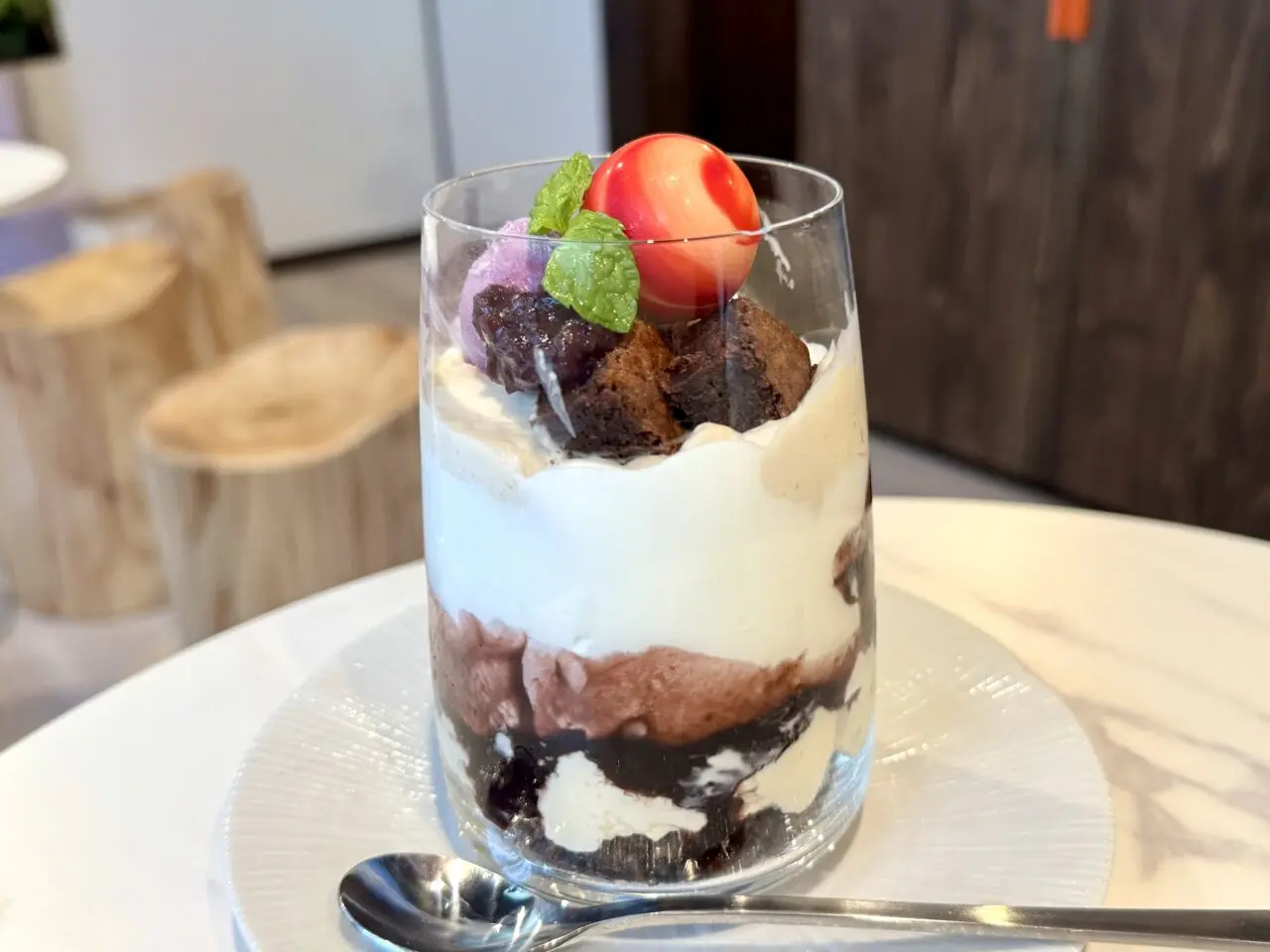 ひと目見たらときめいてしまう豪華なパフェは「たっぷりホイップクリームの松本城パフェ」です。白と黒の層に季節折々の手まりのトッピング。スプーンで食べ進めていくと層を通過するたびに色々な味わいが楽しいパフェ、一番下にはサクサクのクッキーが♪