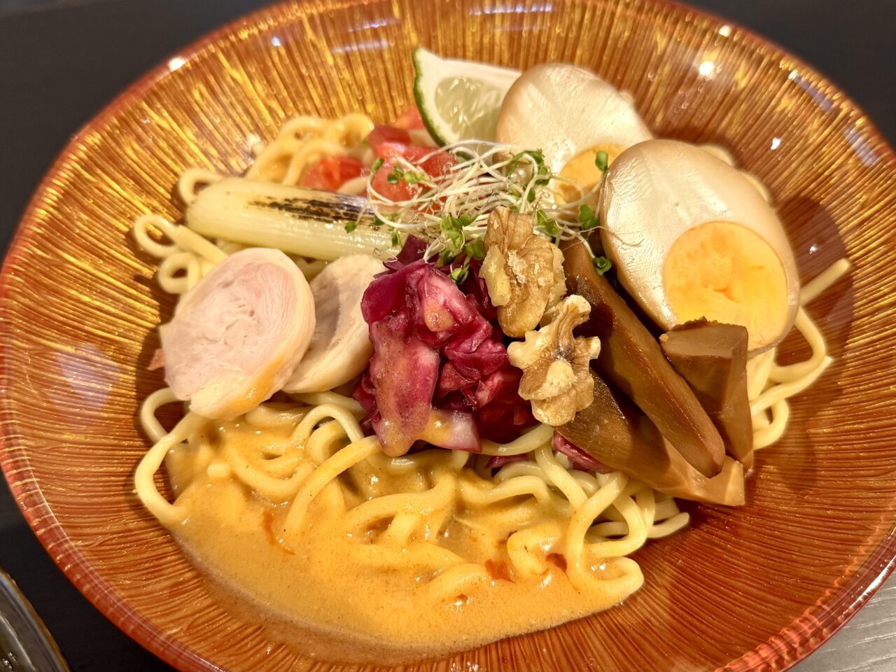 「8つの食材と鰹出汁香るタイ風ココナッツカレーの和え麺」は8つの彩鮮やかな食材を鰹の旨味を補ったタイ風のココナッツカレーソースと中華麺を混ぜながら楽しめます。