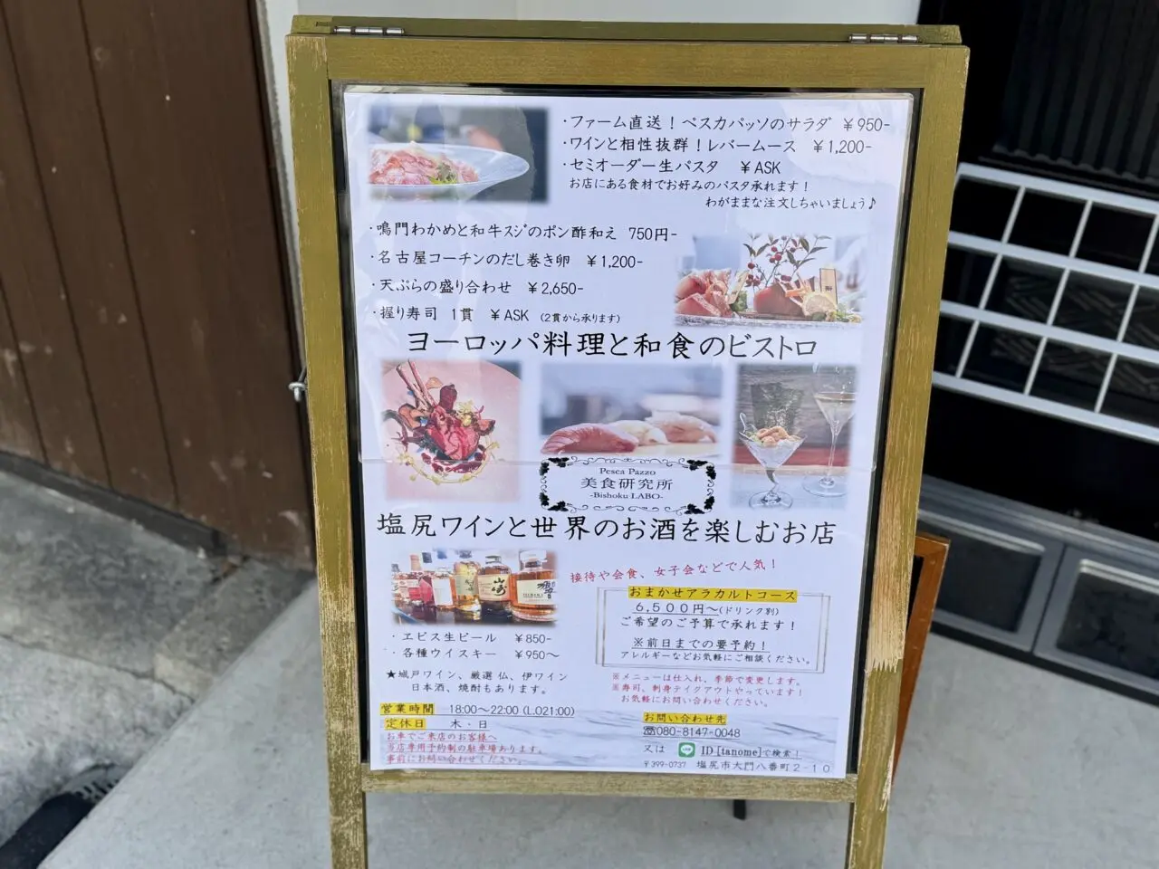 店舗前には立て看板がありました。ヨーロッパ料理と和食のビストロ、塩尻ワインと世界のお酒を楽しむお店とあり、美味しそうなメニューが書かれています。