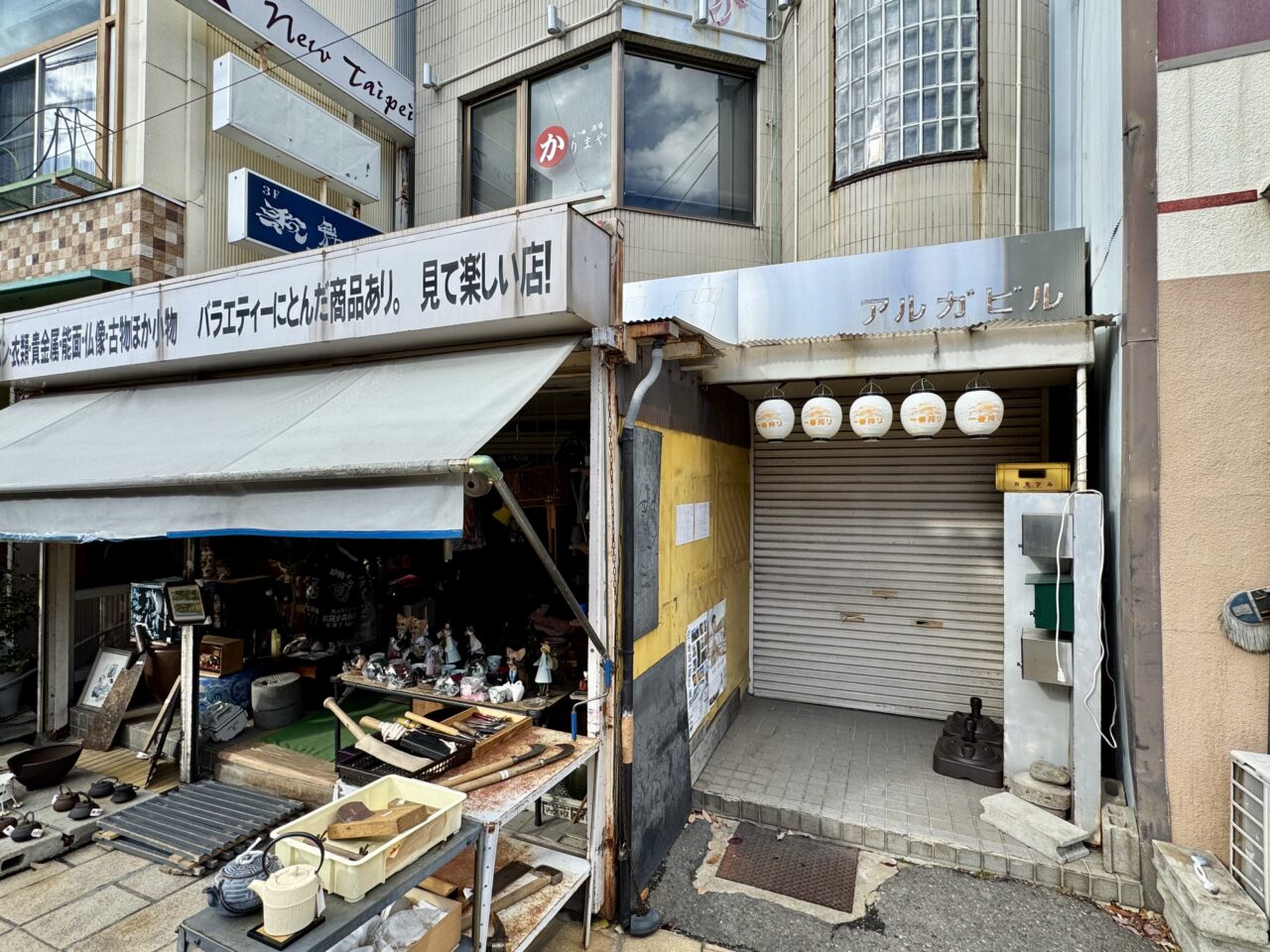 まだ営業時間前でしたのでシャッターが閉まっていましたが、下の写真右側の白い一番搾りの提灯が並んでいるところが入り口です。シャッターが開くと2階へ続く階段があります。