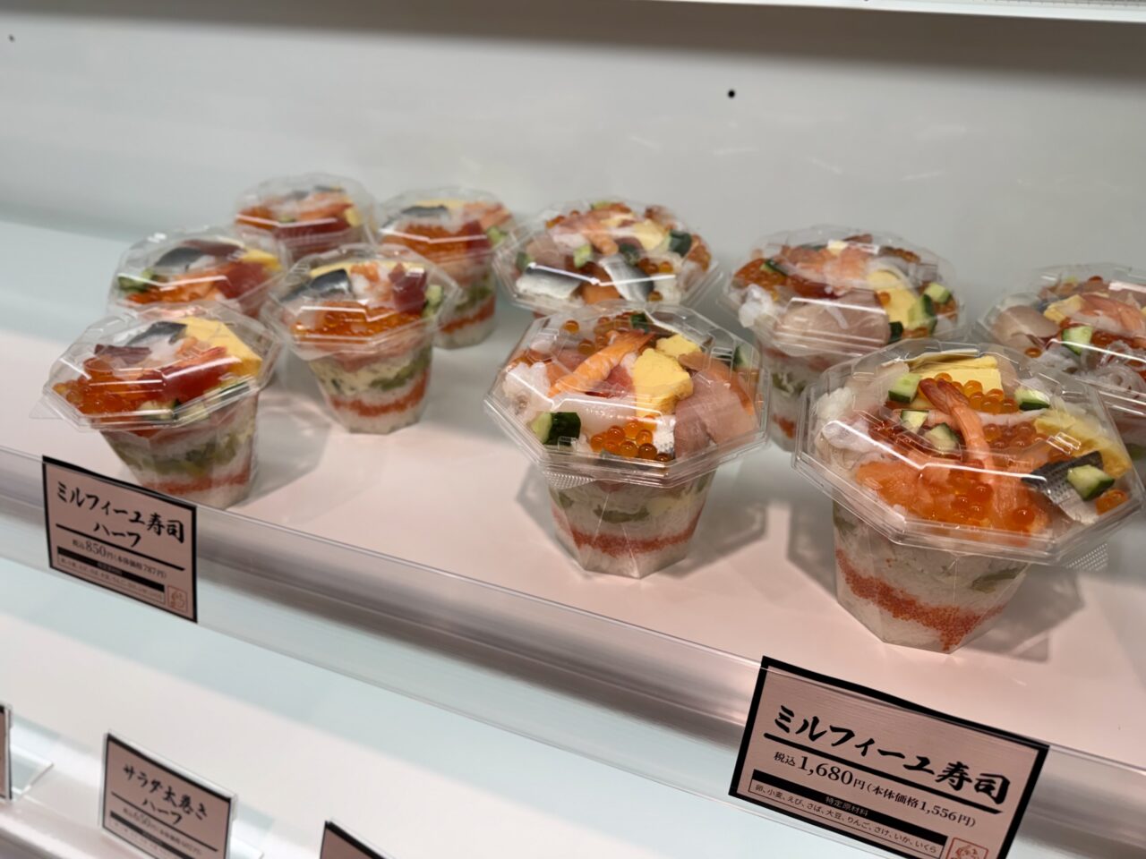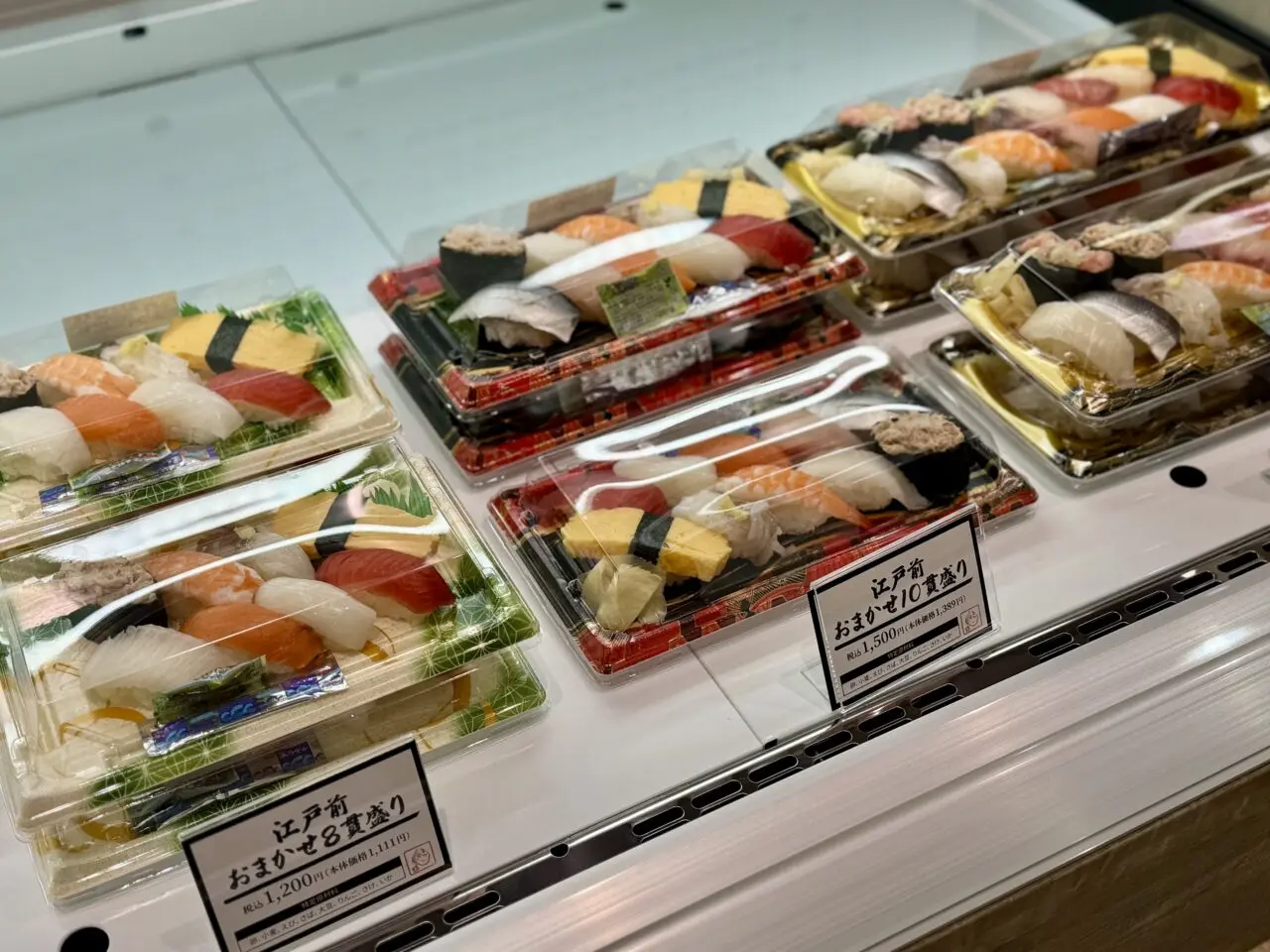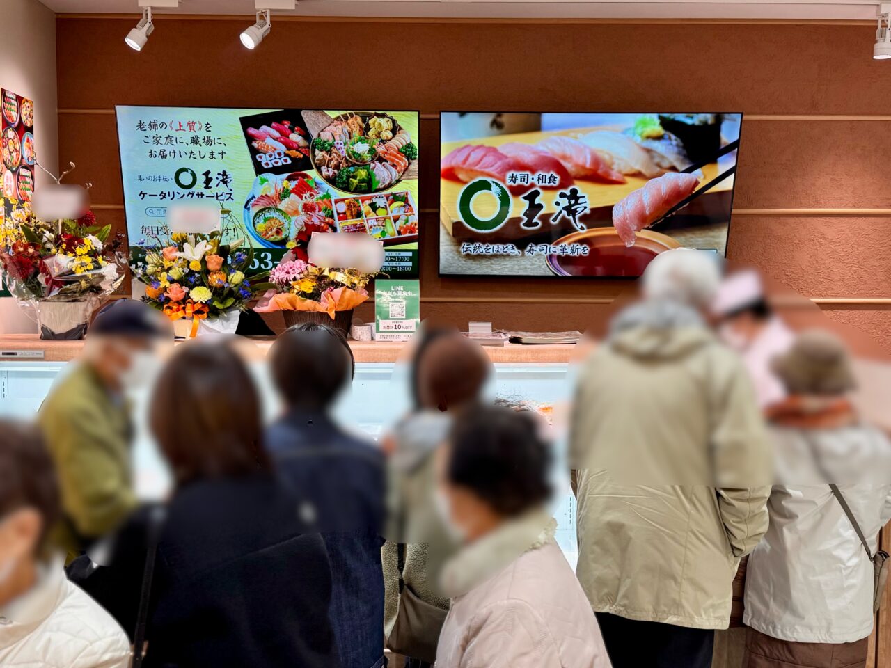 ショーケースの前にはお客様が並んでいました。テイクアウトでは、握りずし、いなり、太巻きなど様々な海鮮があります。