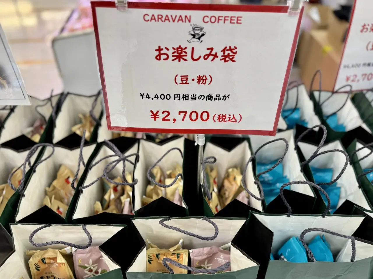 CARAVAN COFFEEのお楽しみ袋にはコーヒーの豆・粉が入っています。コーヒーも値上がりしていますのでお得に購入できるのは嬉しいですね。POPUPの期間などについてはアイシティ21ホームページのチラシをご確認ください。