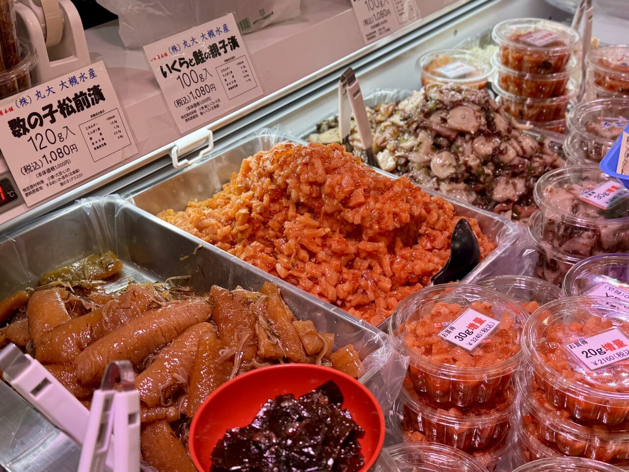数の子松前漬などご飯のお供にもぴったりな商品が多数あります。「丸大大槻水産」の出店期間は12月5日〜10日です。