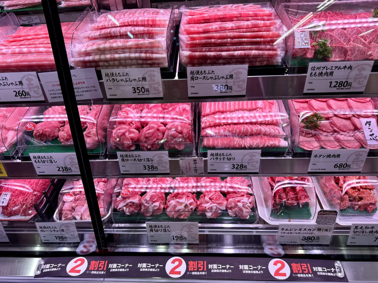 お店の方によると「目玉商品がたくさんあります!」ということで売り場を見てみるとまずは対面コーナーは2割引(一部商品除く)の表示が!綺麗な色のお肉がたくさん並んでいます。