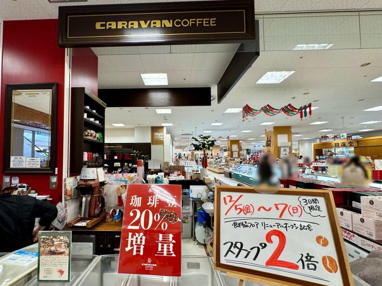 CARAVAN COFFEEでは12月5日〜7日の3日間限定で食料品フロアリニューアルオープン記念としてスタンプ2倍となっています。