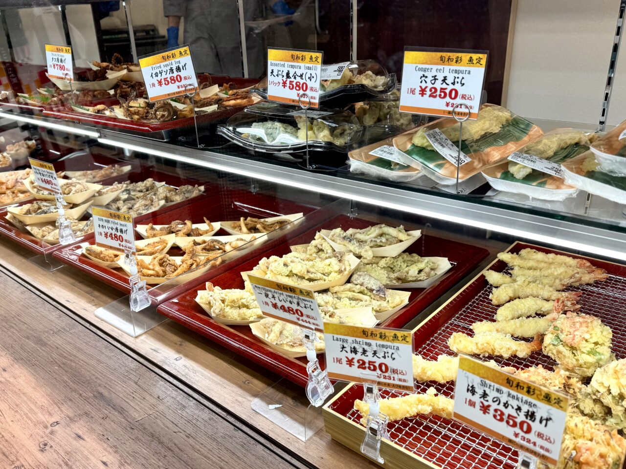 魚を使った天ぷらや唐揚げがたくさん並んでいます。とにかく種類が豊富です!