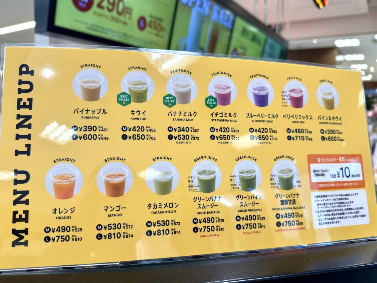 メニューのラインナップを見てみるとたくさんのフルーツジュースがあります。ミルクと合わせたメニューやミックス、スムージーも。お好きな一杯を見つけてみてくださいね。