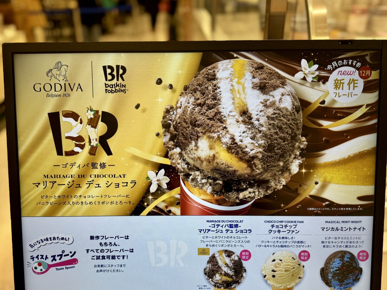 12月の新作フレーバーはゴディバ監修の「マリアージュデュショコラ」、ビターとホワイトのチョコレートフレーバーにバニラビーンズ入りのきらめくリボンがとろーり、豪華なアイスになっています!