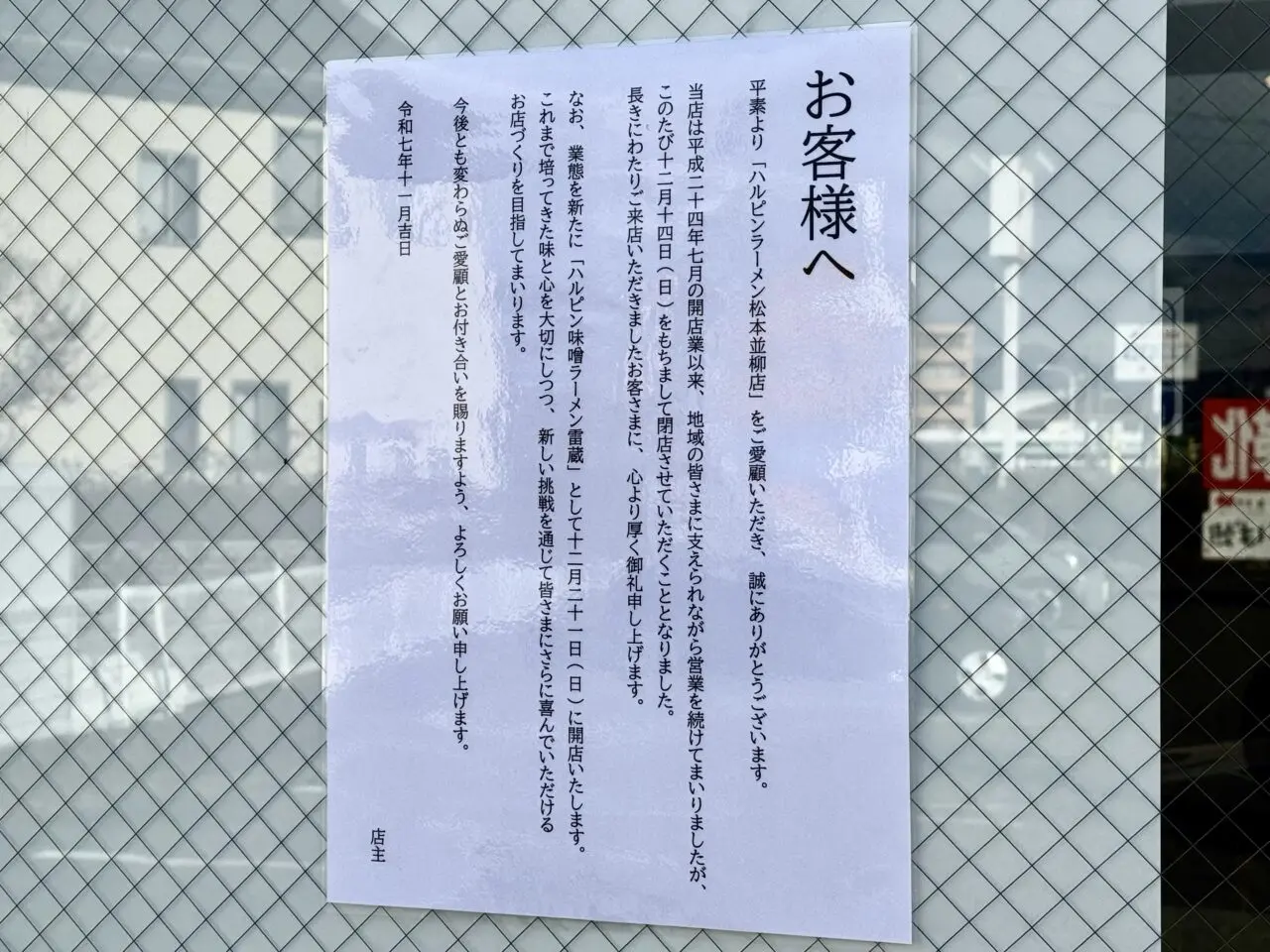 何かお知らせがあるかなと近づいてみると「お客様へ」という貼り紙がありました。それによると、2025年12月14日(日)をもって閉店してしまうということが書かれています。続いて『業態を新たに「ハルピン味噌ラーメン雷蔵」として12月21日(日)に開店いたします。』とありました。