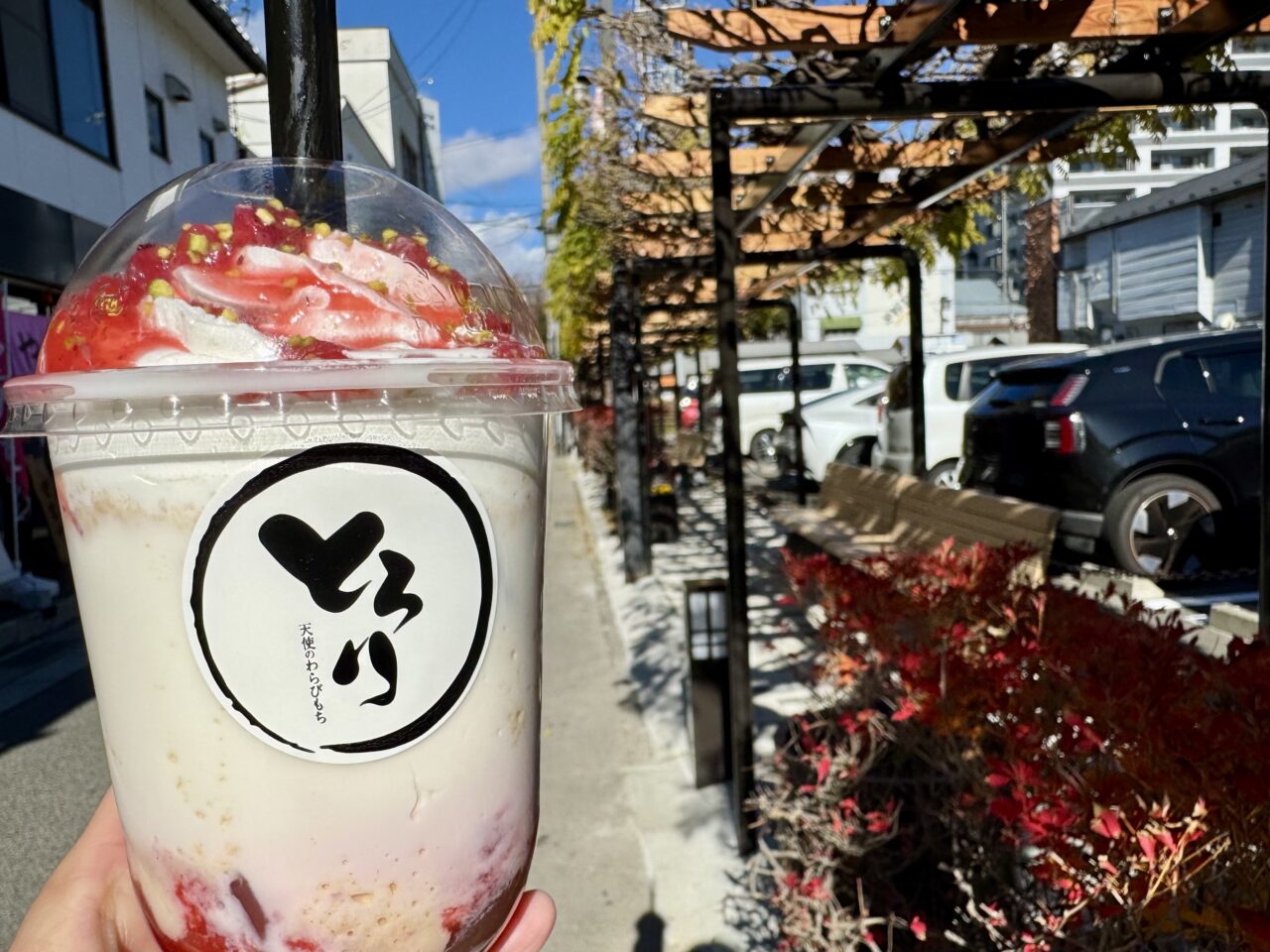 中町通りの蔵の街の雰囲気を楽しみながら「 松本商工会議所中町駐車場」の横にあるベンチのところでいただきました!甘いミルクといちごソースが美味しい贅沢なドリンクになっています。太いストローから、とろ〜っとわらびもちが出てくる感覚が面白いので、気になる方はぜひ試してみてくださいね。