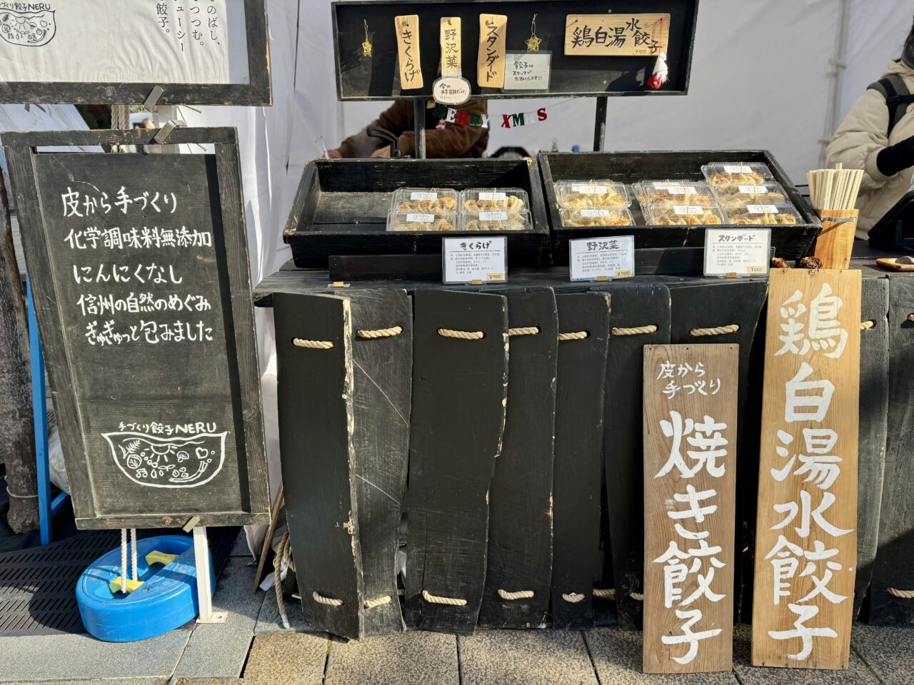 皮から手作り、化学調味料無添加、にんにくなし、などこだわりの手づくり餃子を販売していました。看板にある「鶏白湯水餃子」はインスタグラムに投稿がありましたよ。