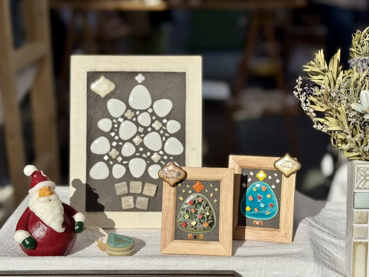 クリスマスにぴったりのツリーのデザインになっているにタイルボード。大きなツリーは飾れないというお家でも、これなら飾りたいところに置けば手軽にクリスマスの雰囲気を出してくれます。キラキラしたタイル素材が素敵です♪