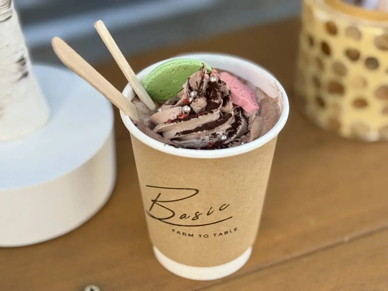 中のドリンクはホットチョコレートかコーヒーを選べます。ポイントはパティシエさんが作ってくれたという緑色の丸いマカロンラスク。サクッとして美味しいです。甘めが好きなのでホットチョコレートを選びました。あったかくて甘くて可愛いドリンクをいただきました♪