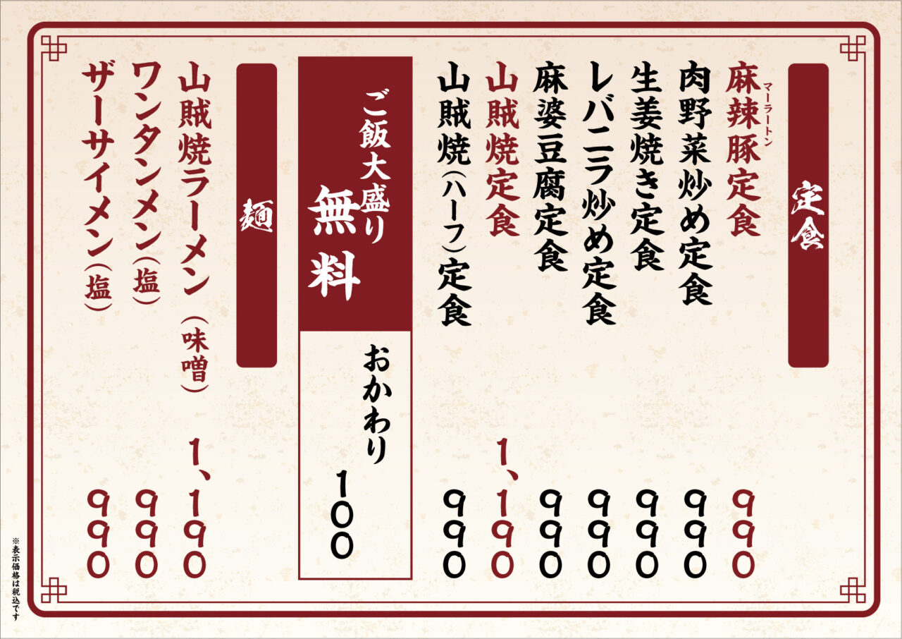 お店の方によると、しばらくランチの時間は以下の定食と麺のランチメニューのみとなるということです。ランチ営業が始まった12月16日にお邪魔しましたが、定食では「レバニラ炒め定食」が人気、麺は「山賊焼ラーメン」が出ているそうです!