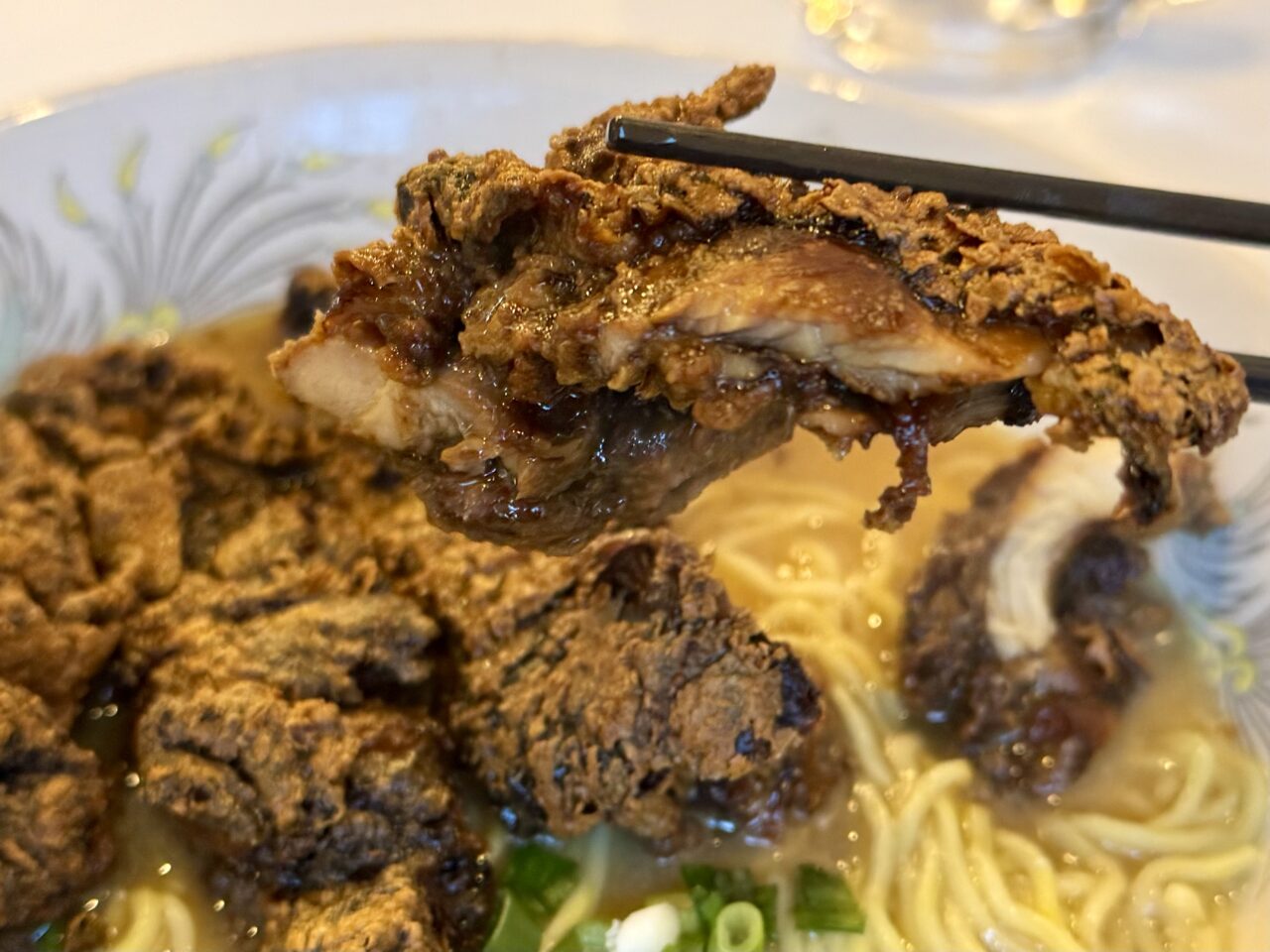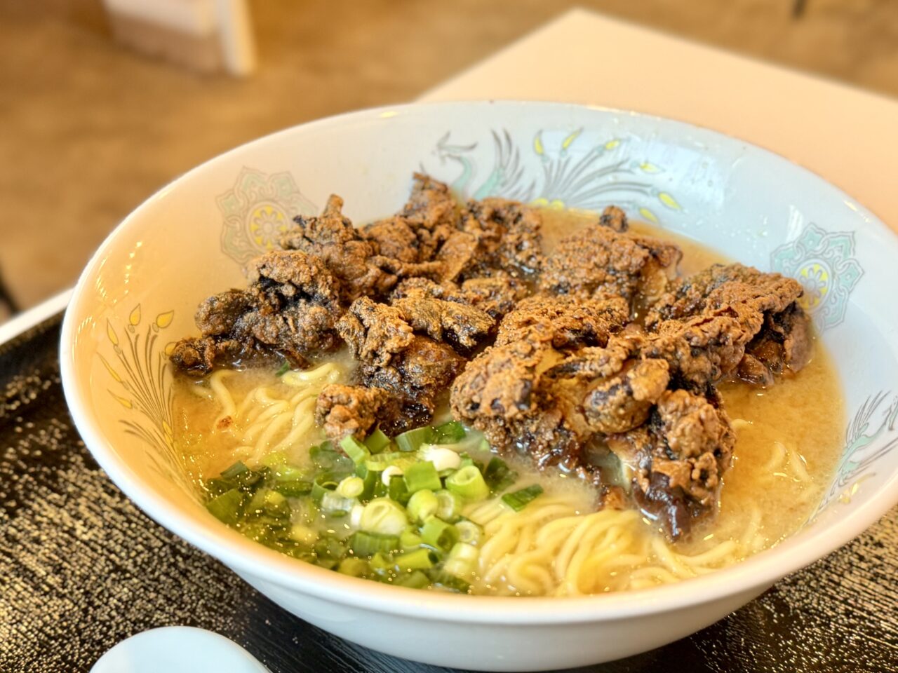 味噌ラーメンの上にたまり醤油やにんにくなどで味付けをした大きな山賊焼がのっています。スープについた部分と上のザクっとした食感も美味しくて大満足のボリュームでした。