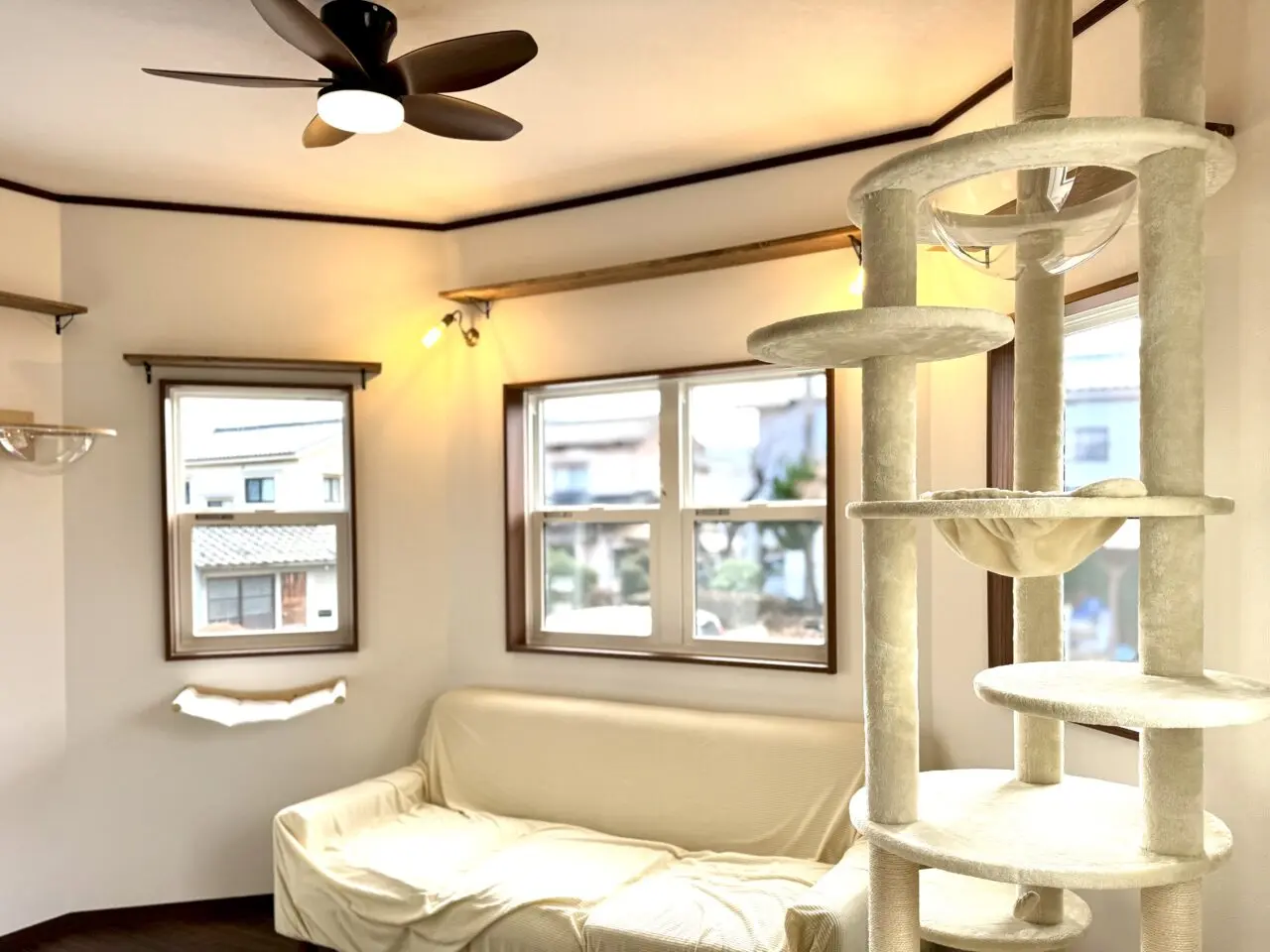 リビングのすぐお隣にはソファーやキャットタワー天井には猫が歩く通路も見えます。ここで猫たちが動いているのを想像してしまいますね。