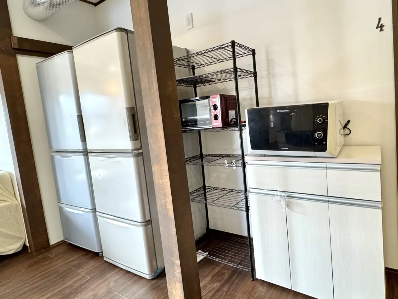 冷蔵庫が2つと棚、トースター、電子レンジがあります。