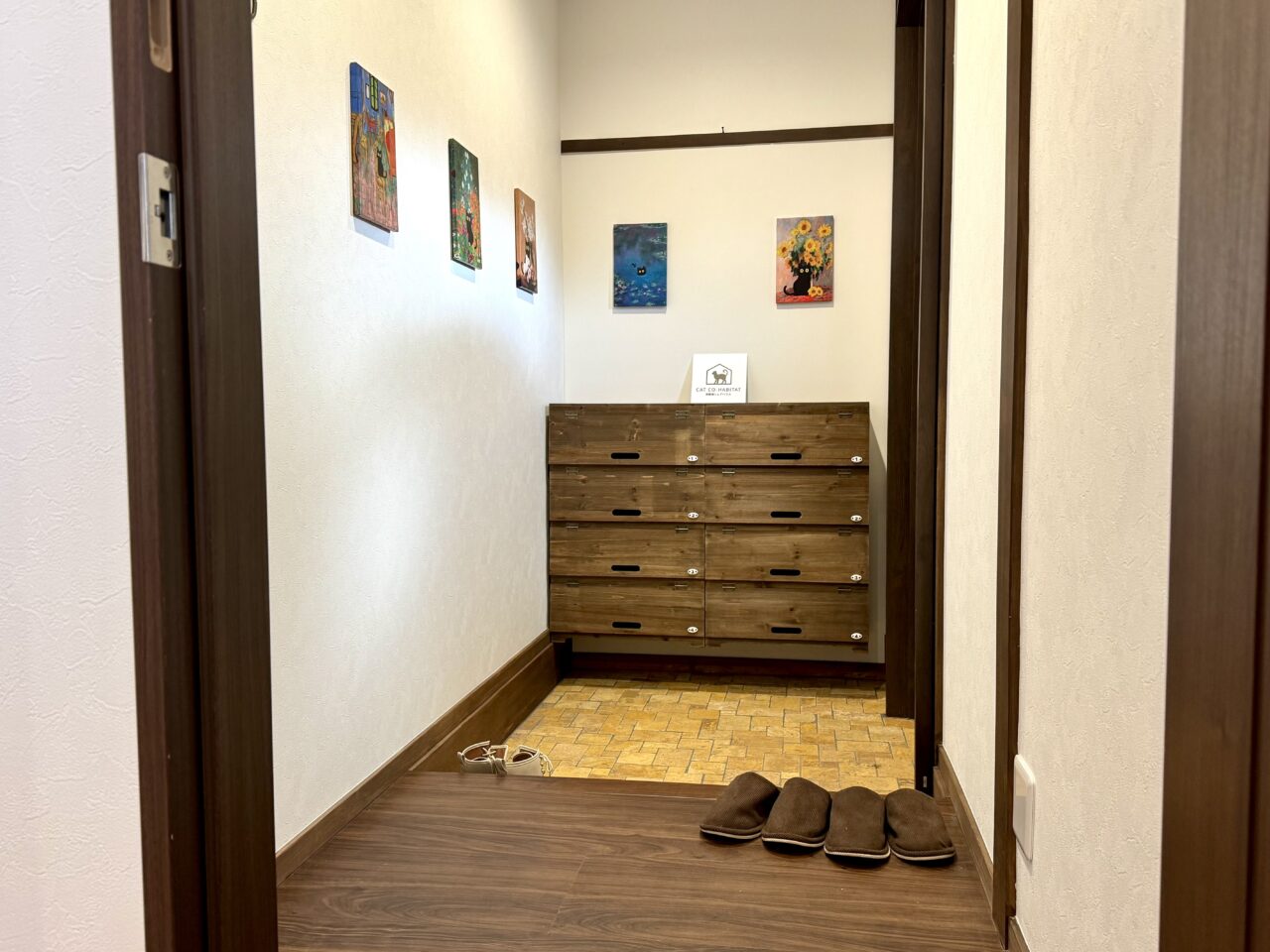 こちらが玄関です。壁には猫の絵が飾られています。↓
