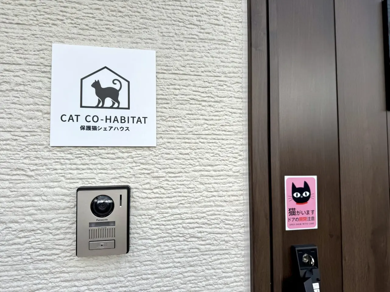 玄関には「保護猫シェアハウス CAT CO-HABITAT」、ドアノブの上にある「猫がいます」の表示が可愛いですね。