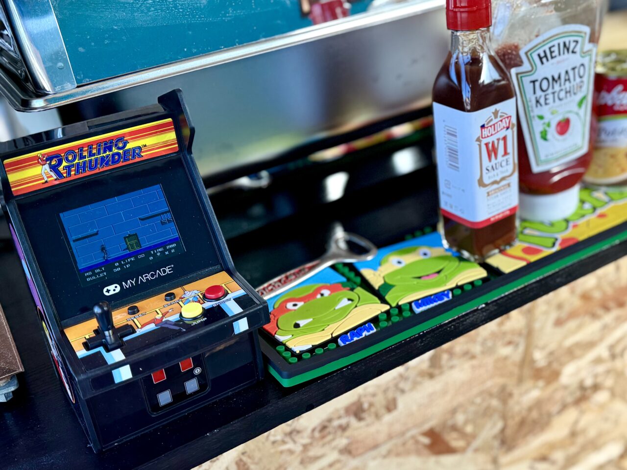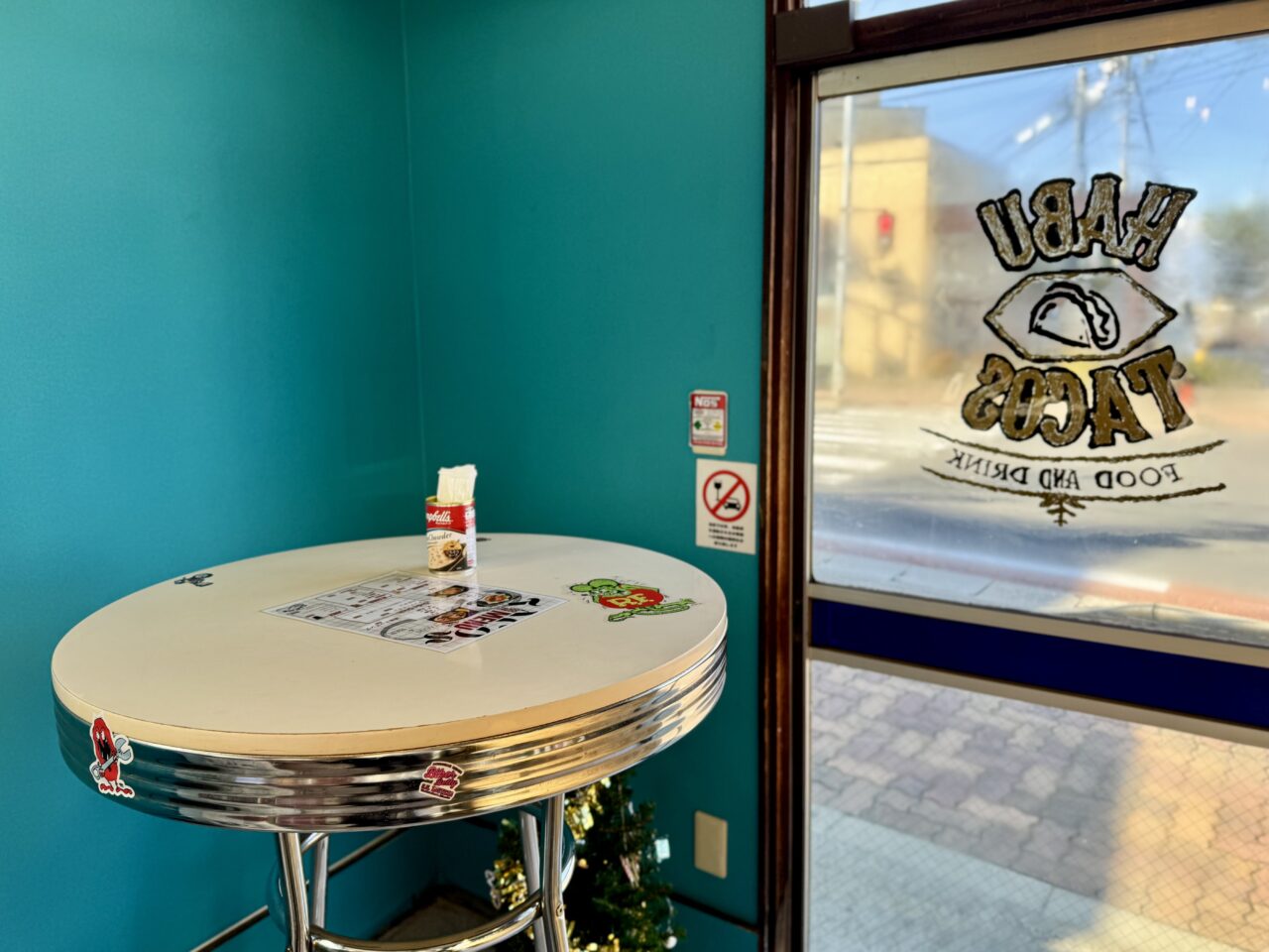鮮やかな壁色が映えますね。スタンディングで食べることができる丸いテーブルがありました。椅子もありましたので座ることもできます。
