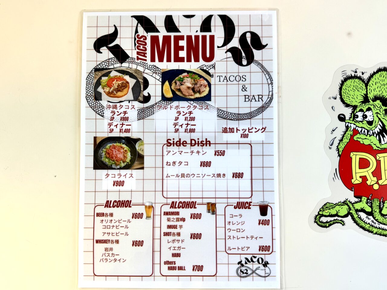 メニューがこちらです。ランチタイムにお邪魔しましたよ。「沖縄タコス3P」を注文、初めての沖縄タコスが楽しみです。アルコールやジュースもあります。