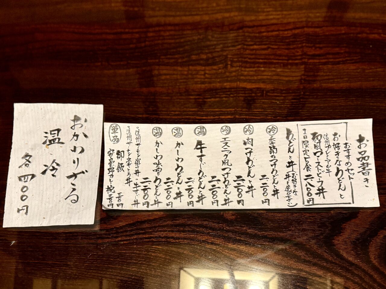 それでは気になるメニューを見ていきましょう!地元安曇野の食材に拘ったメニューとなっています。人気のメニューをお聞きしたところ、冷たいうどんでは「季節のつけうどんと丼」、温かいうどんは「かしわうどんと丼」と教えていただきました。メニューにはありませんが冬季限定の「柚子香る鴨つけうどん」もおすすめです。また、セットメニューに+500円(税込)でこだわり抹茶スイーツを付けることができます。