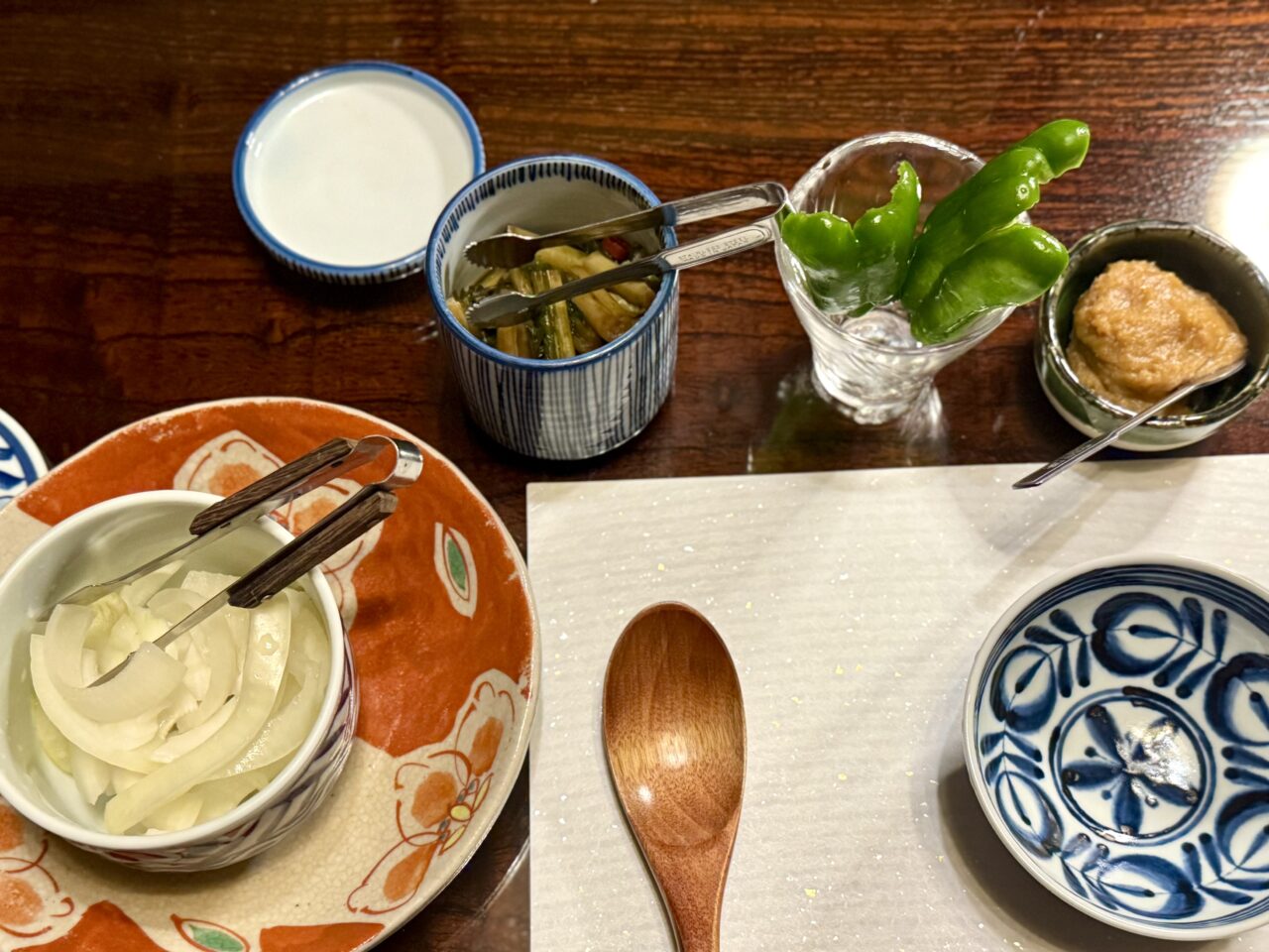 メインのうどんが出てくる前にいただけるのは、安曇野産の玉ねぎを甘酢でつけた和風の甘酢漬け、野沢菜漬け、生のピーマンになります。