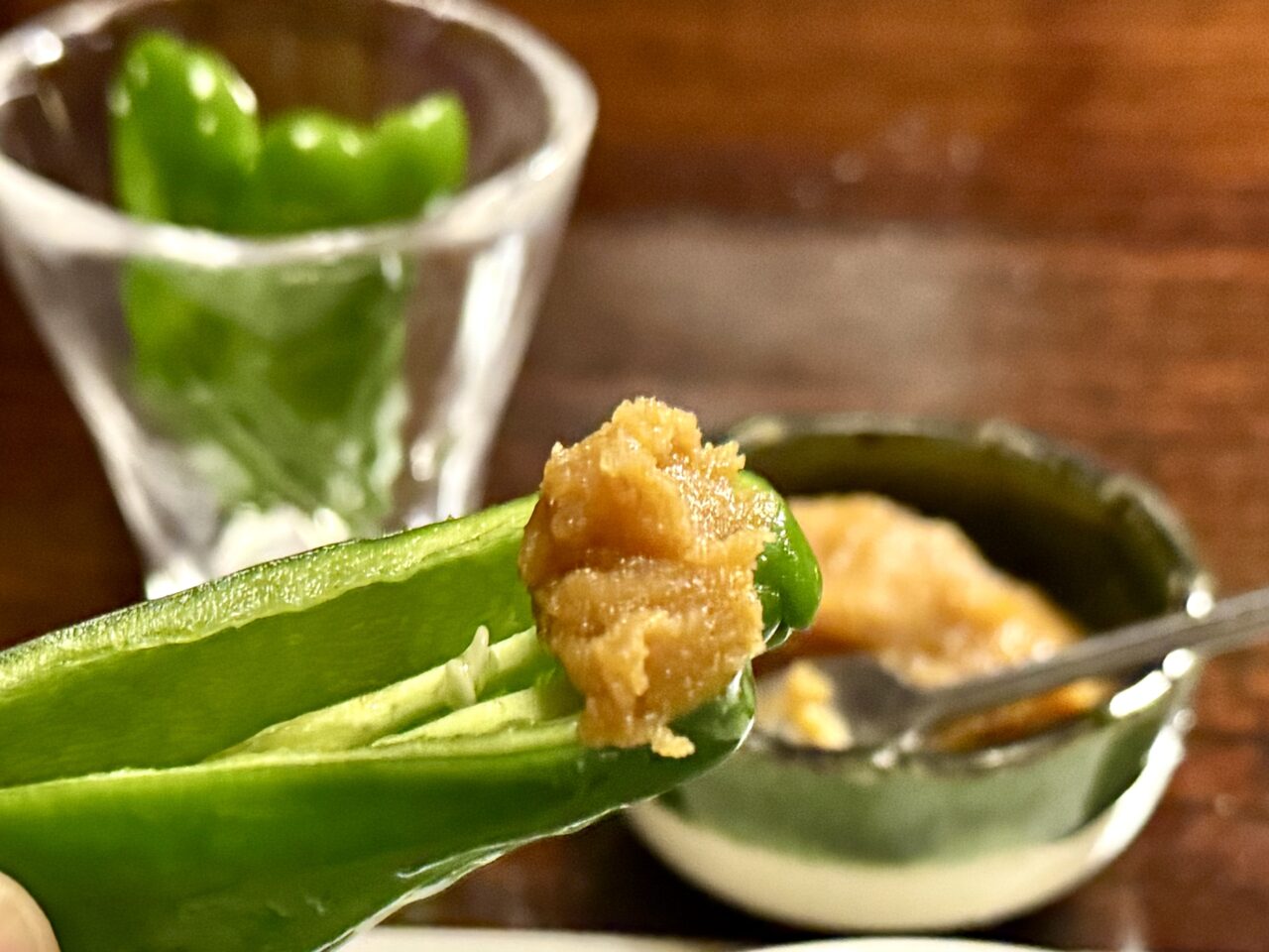 安曇野の綺麗なお水でしっかりさらした後に氷水でしめてあるという生ピーマンはシャキシャキ!甘味噌をつけていただきます。