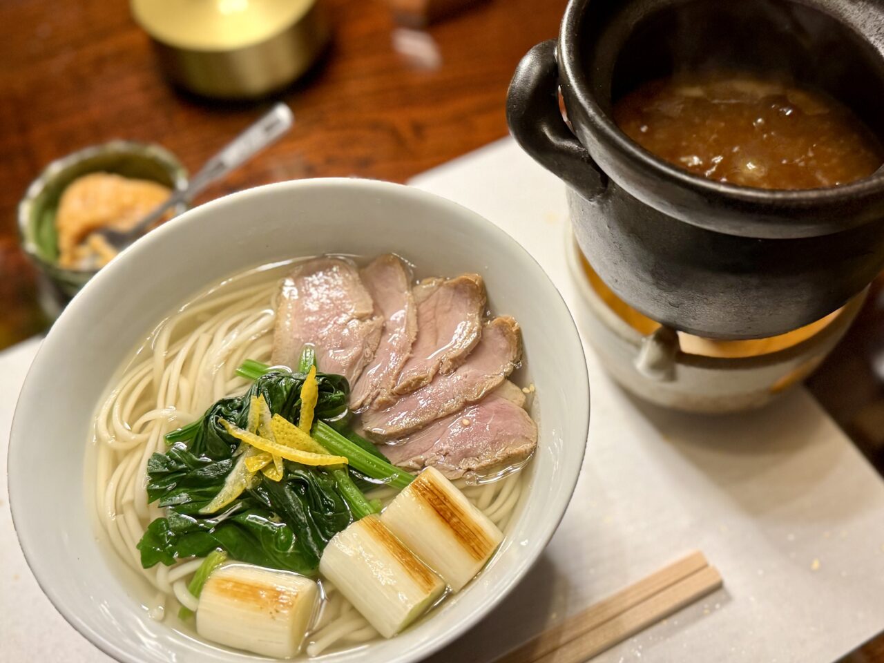 うどんがきました!冬季限定の「柚子香る鴨つけうどん」です。お出汁を堪能しながらうどんを食べるのも美味しいですし、右上のぐつぐつしたお鍋に麺をつけていただくとまた違ったお味を楽しめます。どちらでもお好みで召し上がってください。
