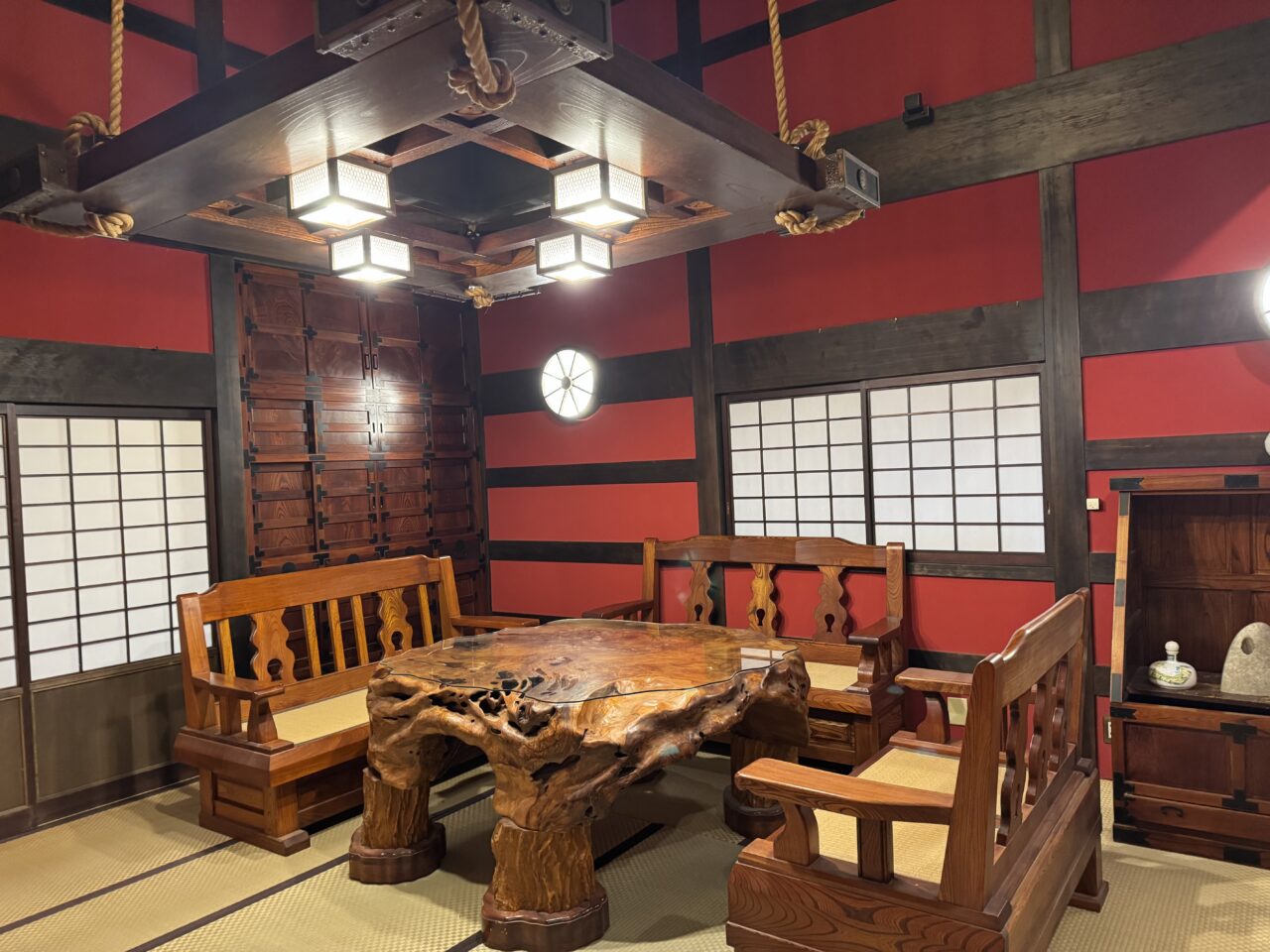 こちらは、お席が満席の時に待つお部屋になります。赤い壁が印象的です。
