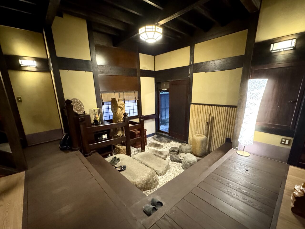 入ると石の段があり、靴を脱いで上がります。