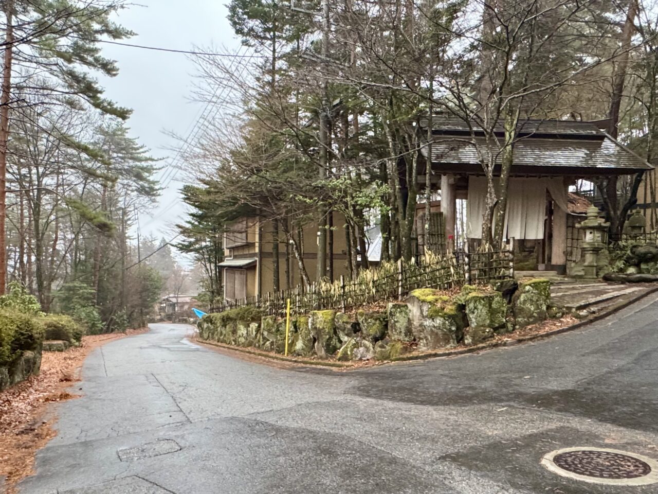 石垣に沿って道路を上っていく石垣ルート。進んでいくと白い暖簾と門が見えてきます。