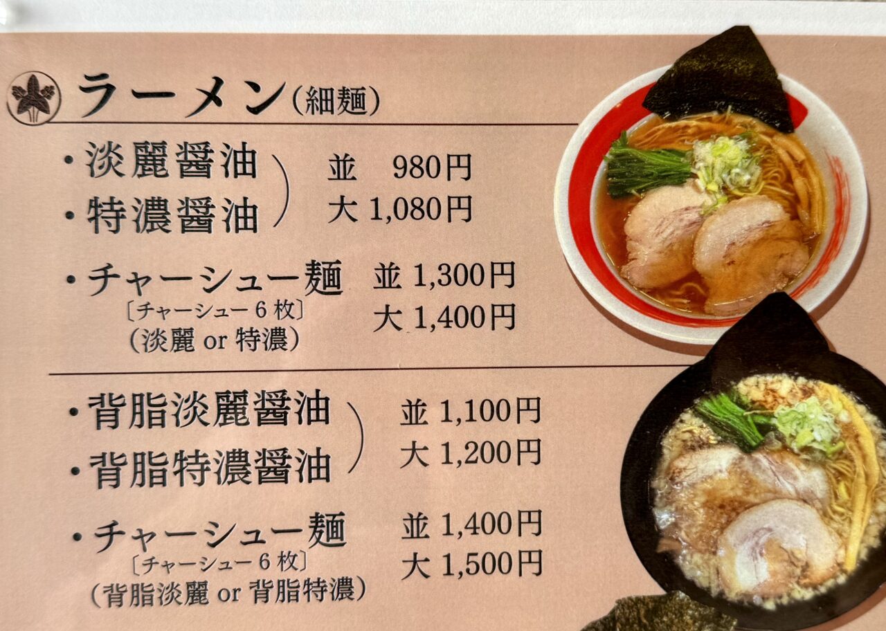 ラーメン(細麺)は淡麗醤油、特濃醤油がありお好みを選べます。背脂入りのコクとまろやかなラーメンを楽しみたい方は背脂淡麗醤油、背脂特濃醤油も。気になる背脂まぜそばは特注の極太麺に背脂を絡めたまぜそばです。麺の量が小から大まで選べるのが嬉しいポイントです。