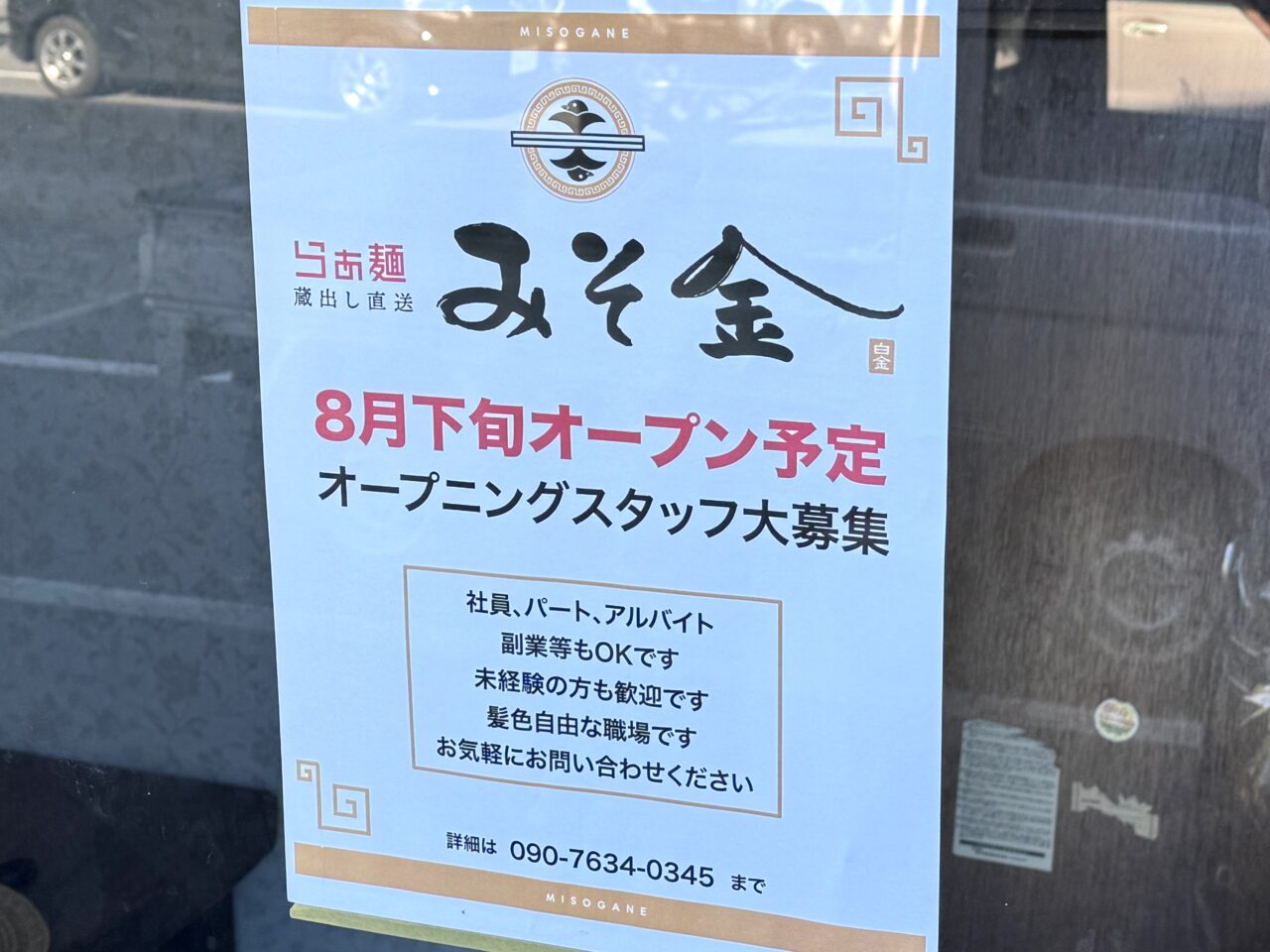 看板には「らぁ麺 みそ金」蔵出し直送、右側にはMISOGANEとあります。店名の読み方は「みそがね」です!しろがねグループの味噌ラーメン店になります。