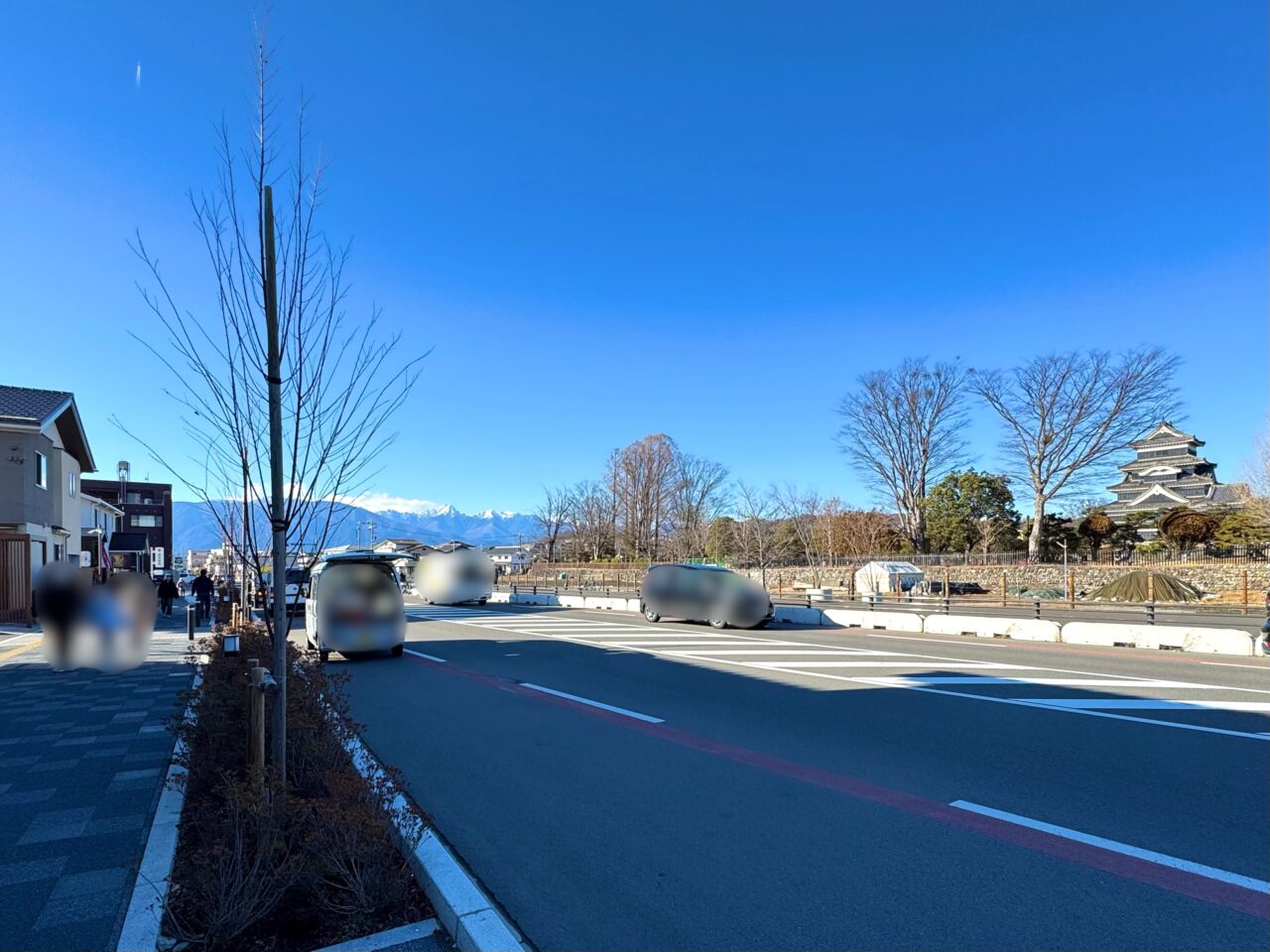 国宝松本城の目の前に2026年1月1日(木)おむすび屋さんがオープンします!下の写真では右側に松本城が見えていて、その道路を挟んで左側に手作りおむすび店「おむすび仁」がありますよ。松本城の南側になります。