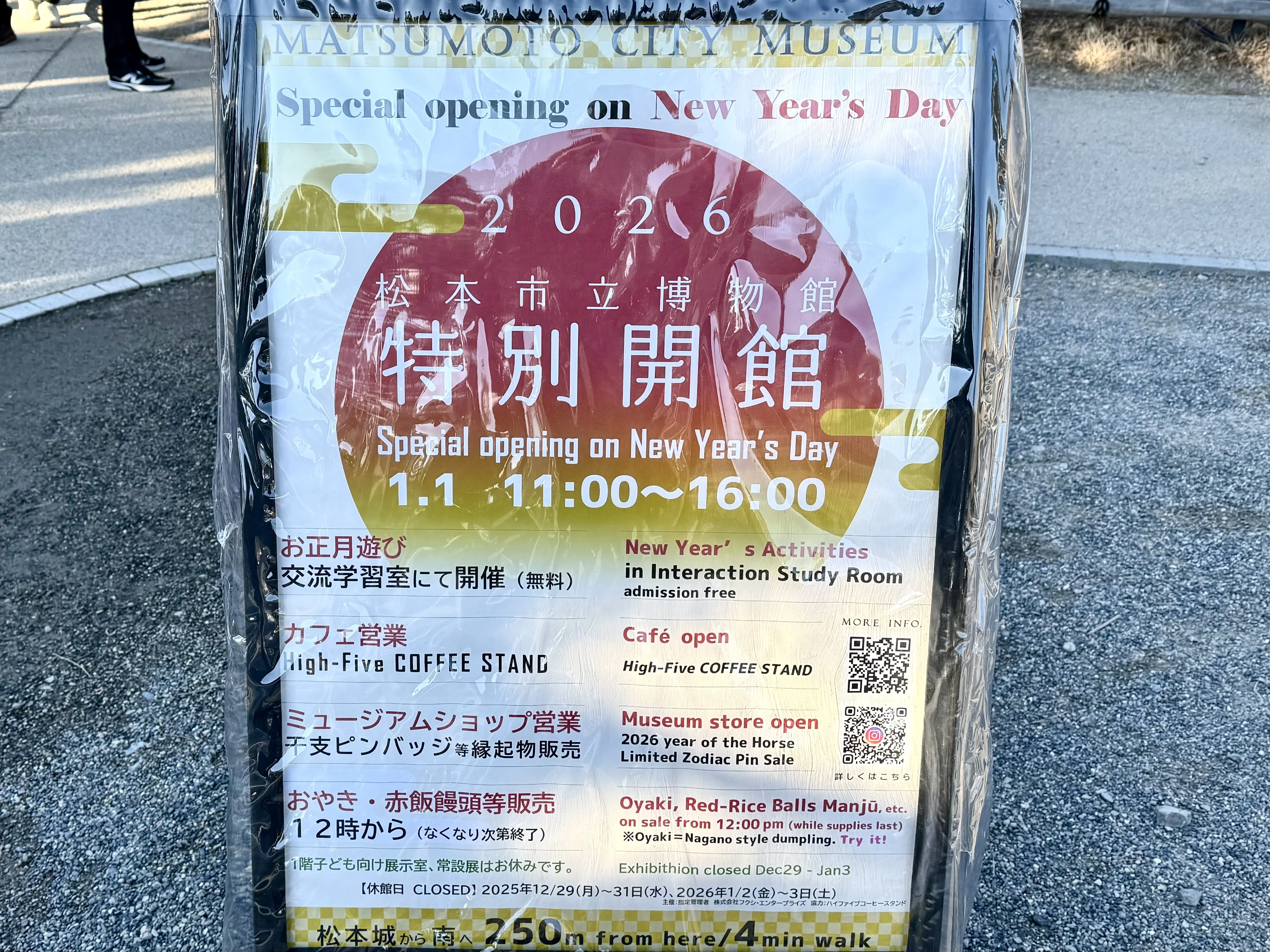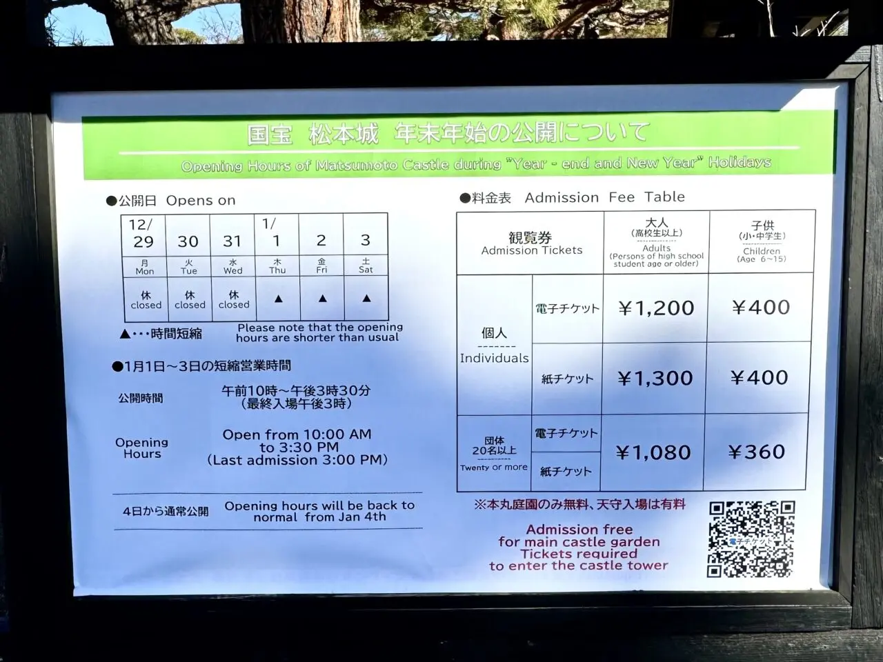 そのすぐ横には松本城の年末年始公開についての案内板がありました。2026年1月1日〜1月3日は公開時間が短縮されますのでご注意ください。4日からは通常公開となります。