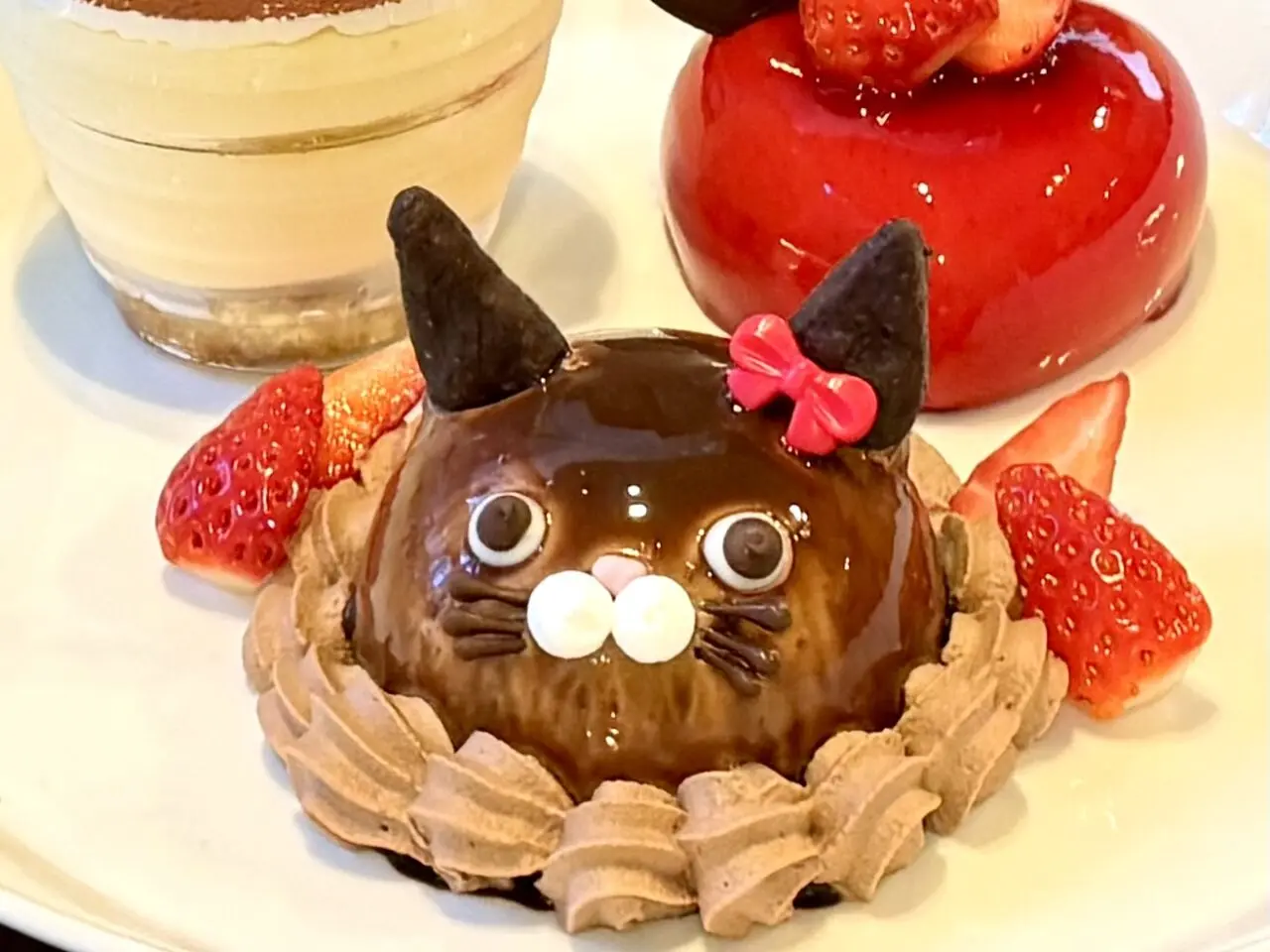 かわいい猫のケーキは「おしゃれキャット」ムースショコラです。濃厚ムースショコラにコクのあるブリュレを閉じ込め、ビスキュイショコラの生地の底にはチョコレートのサクサククランチをしきました。このプレートの主役はリボンでおめかししたおしゃれキャットです。