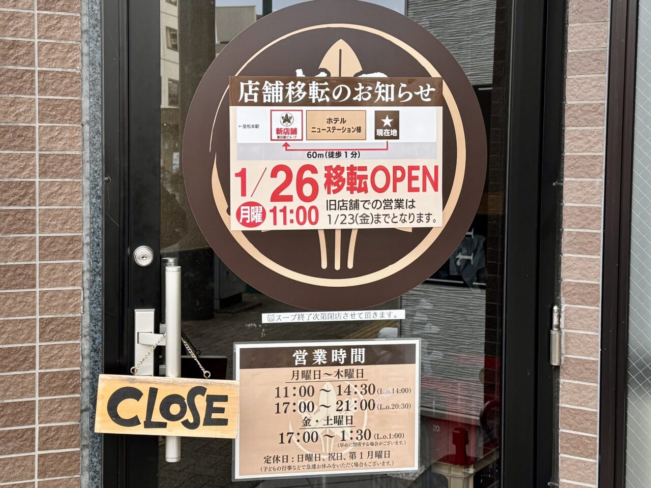 入り口には「店舗移転のお知らせ」の貼り紙がありました。距離60m、徒歩1分のせいこうえん跡地へ移転します。こちらの店舗も松本駅からは近い場所でしたが、移転後はさらに松本駅に近くなりますよ。