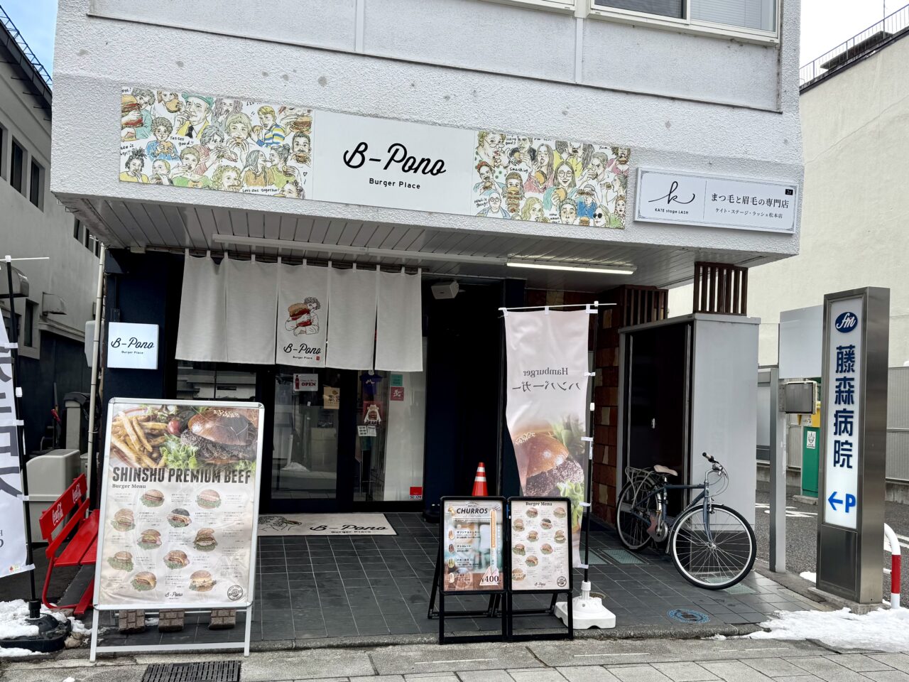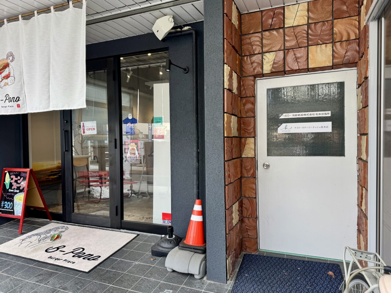 下の写真の生金ビル2階に「 ケイト・ステージ・ラッシュ松本店」があります。1階はバーガープレイスB-Ponoが営業しています。