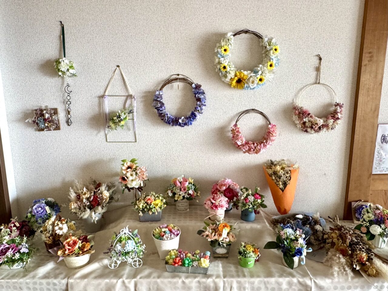 HANAMIZUKIさんはフラワーアレジメンと販売も。さらに今回はフリマ~幼児から大人の古着、小物、おでん、からあげと盛りだくさんの内容です。