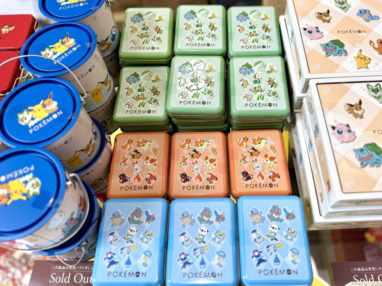 缶に入っている物も多くあり、食べた後も入れ物として楽しめます。下の写真、真ん中の商品は「スイーツ旅立ち缶」です。それぞれくさタイプ、ほのおタイプ、みずタイプから選べます。
